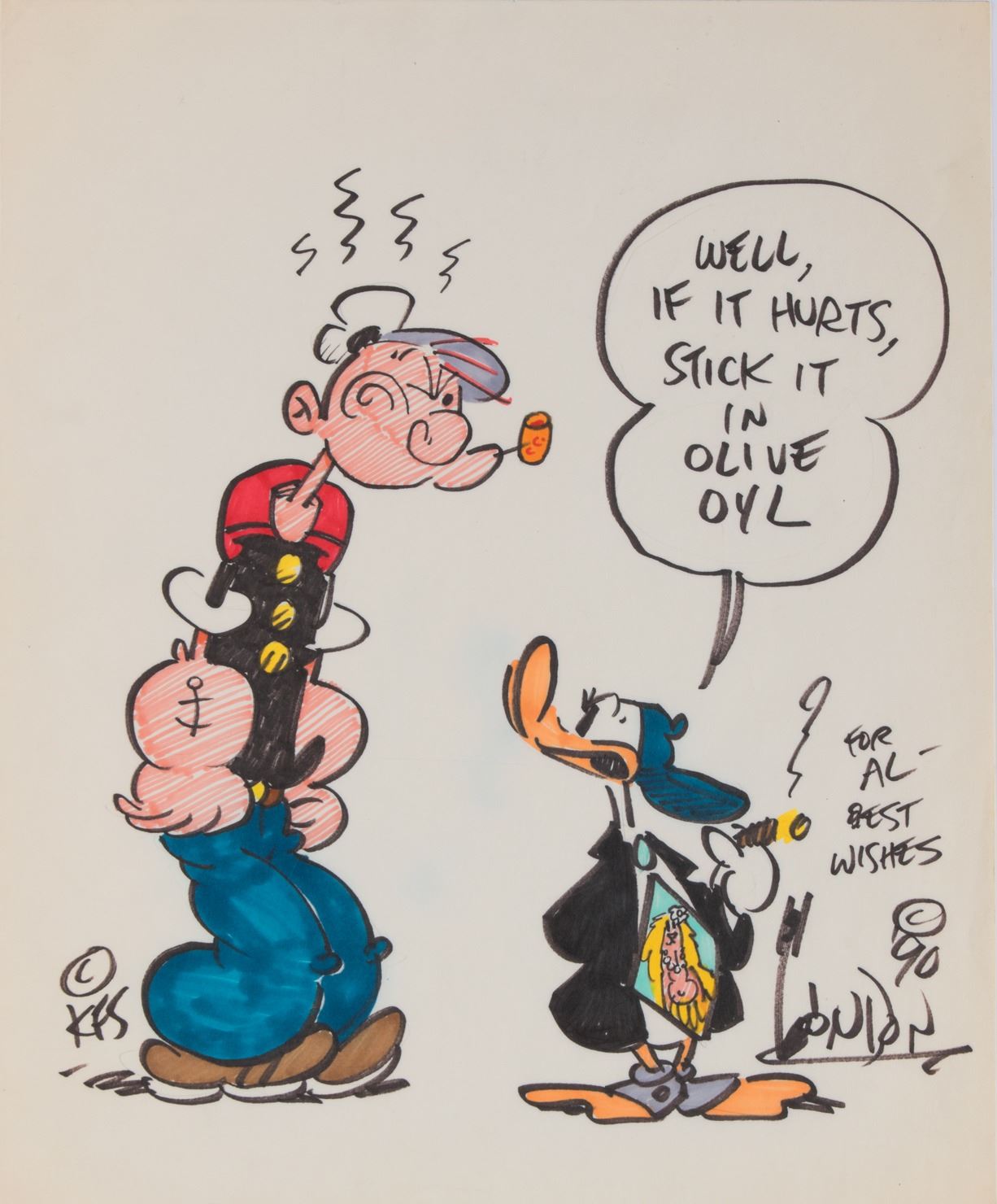 160. Bobby London original commissioned artwork "Dirty Duck meets Popeye". (1990) Accomplished in marker on 14 x 17 in. artist's leaf. Fine drawing by London of his signature creation, Dirty Duck, along with the iconic character "Popeye", who the artist would illustrate later in his career. A colorful and energetic drawing! In very good condition. $200 - $300