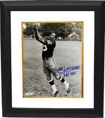 During his first six seasons with the Redskins, Bobby Mitchell never caught fewer than 58 passes. When he retired, his 14,078 combined net yards was the second highest total in NFL history.[4] He had also scored 91 touchdowns (18 by rushing, 65 on receptions, 3 on punt returns, and 5 on kickoff returns). He amassed 7,954 yards on receptions and 2,735 yards on rushes. Bobby Mitchell has hand autographed this Washington Redskins 8x10 Photo with HOF 83 inscription. Certificate of Authenticity from Athlon Sports Collectibles. Custom White Mat and Premium Black Color Framed as shown.
