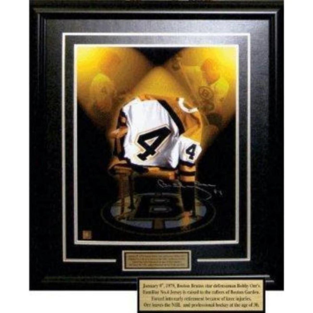 Bobby Orr's Jersey Over a Chair 16 x 20 January 9th, 1979, Bostons Bruins star defenseman Bobby Orr's Familiar No. 4 Jersey is raised to the rafters of Boston Garden. Forced into early retirement because of knee injuries, Orr leaves the NHL and professional hockey at the age of 30, this limited edition Autograph framed is a must have for any Orr Collector or Fan. - All items may be shipped or picked up locally within one week of sale. We will provide shipping estimates to the winning bidders or winning bidders may arrange their own shipping.