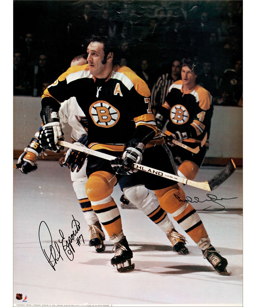 Color 18 x 24 poster of Esposito and Orr on the ice against the Flyers, signed in black felt tip by both. In very good condition with overall creasing and a few scratches, with the most prevalent scratch at the center of the image.