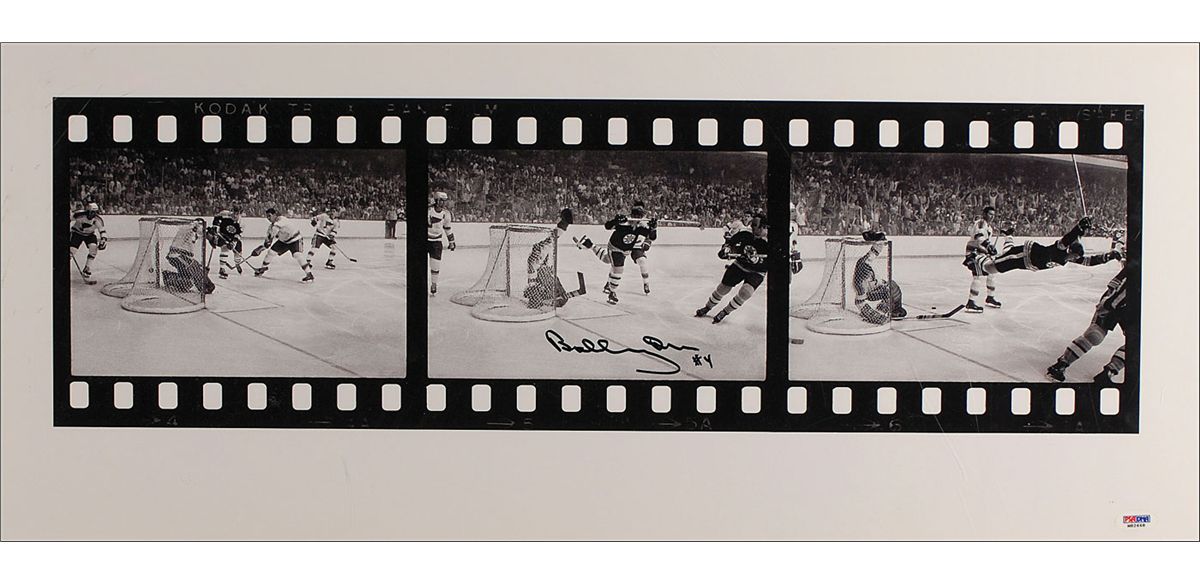 Satin-finish 28 x 12 composite photo of Orr leaping into the air after his Stanley Cup winning goal, signed in black felt tip. Rolled and in fine condition, with a PSA/DNA authentication label affixed to lower corner. Accompanied by a certificate of authenticity from PSA/DNA.