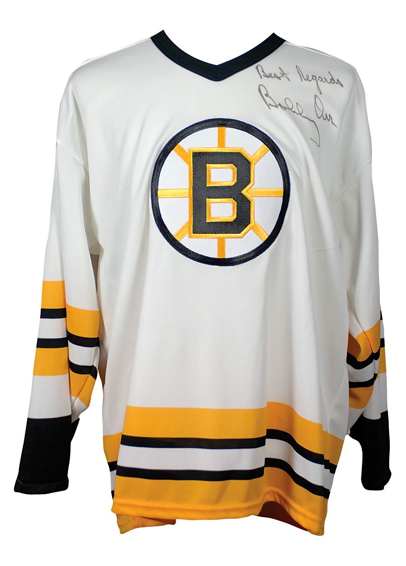 Official CCM replica Boston Bruins hockey jersey, with sewn on letters and numbers, signed in felt tip on the front, “Best regards, Bobby Orr.” In fine condition.
