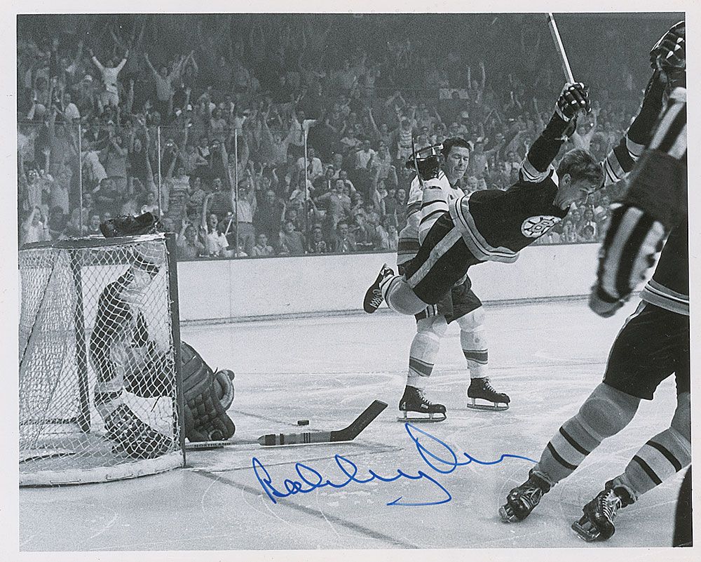 Glossy 10 x 8 photo of Orr’s famous Stanley Cup–winning goal, signed in blue felt tip. In fine condition, with subtle scattered surface spotting.
