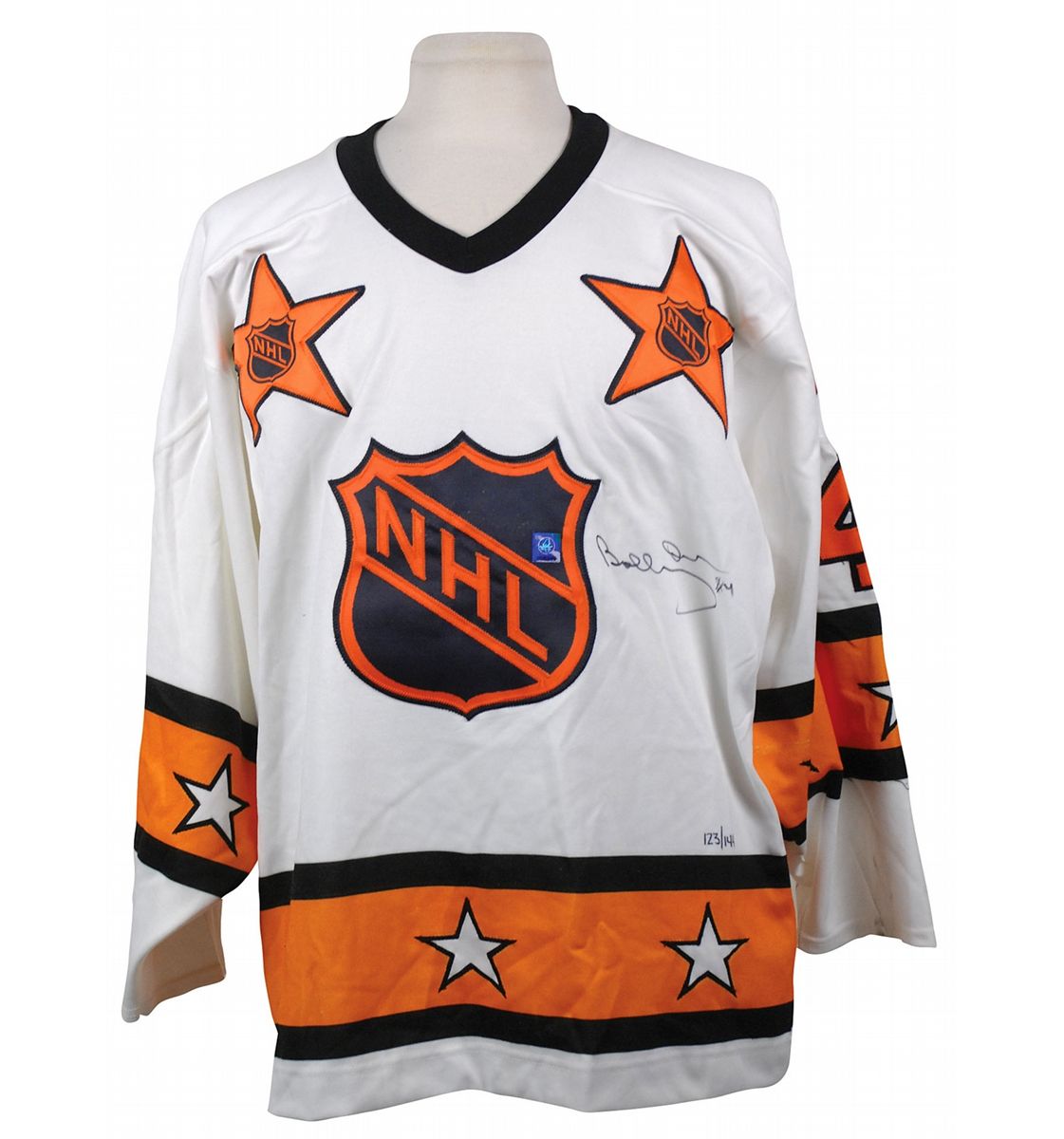 Official limited edition Great North Road replica NHL hockey jersey, numbered 123/144, with sewn on letters and numbers, signed in black felt tip on the front. In fine condition. Accompanied by a certificate of authenticity from Great North Road (Orr’s company).