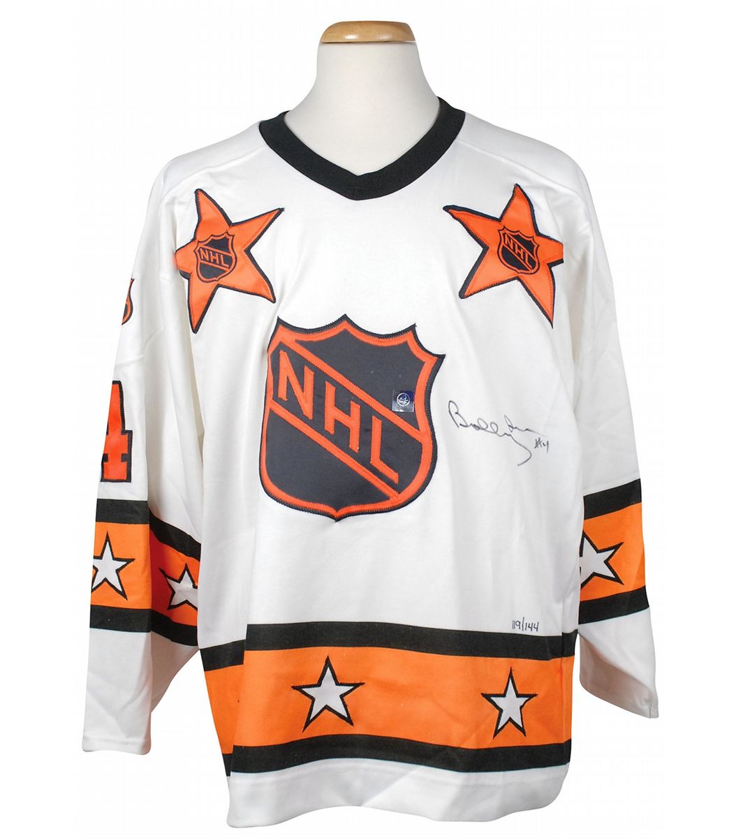 Official limited edition Great North Road replica NHL hockey jersey, numbered 119/144, with sewn on letters and numbers, signed in black felt tip on the front. In fine condition. Accompanied by a certificate of authenticity from Great North Road (Orr’s company).