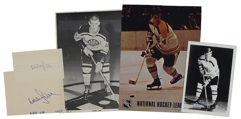 Five items: felt tip signature on an off-white album page; ballpoint signature on an off-white 5 x 3 lined card; vintage color program cover from 1968, signed in blue ballpoint by Orr; glossy 5 x 7 photo, signed in blue felt tip; and a vintage 7.5 x 10 program photo of Orr from 1966, signed in blue ballpoint. In fine overall condition.