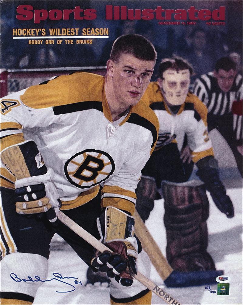 Limited edition color glossy 16 x 20 photo of the cover of the December 11, 1967, issue of Sports Illustrated, #103/444, signed in blue felt tip, “Bobby Orr #4.” Accompanied by a certificate of authenticity from Great North Road (Orr’s company). In very fine condition, a PSA/DNA authentication label affixed to lower corner. RRAuction COA.