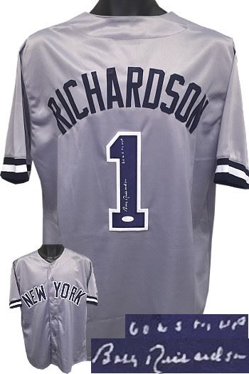 Bobby Richardson played for the New York Yankees from 1955 through 1966. Batting and throwing right-handed, he was a superb defensive infielder, as well as something of a clutch hitter, who played no small role in the Yankee baseball dynasty of his day. He is the only World Series MVP ever to be selected from the losing team. He wore the uniform number 1 (one) for the majority of his career (1958–1966). Bobby Richardson New York Yankees has hand signed this Throwback Gray unlicensed custom-prostyle jersey with twill stitched nameplate and numbers with 60 WS MVP inscription. JSA Hologram and Certificate of Authenticity. Size XL
