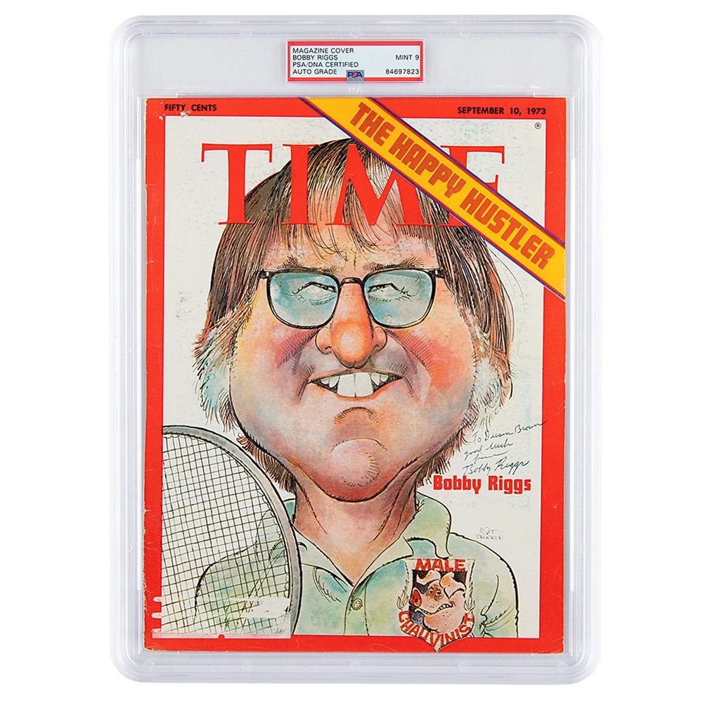 Cover from the Time Magazine of September 10, 1973, featuring a story on & #39;The Happy Hustler,& #39; 8.25 x 11, signed and inscribed in black ballpoint, "To Duane Brown, good luck, from Bobby Riggs." In fine condition, with pinholes to the upper left corner. Encapsulated and graded by PSA/DNA as "MINT 9."