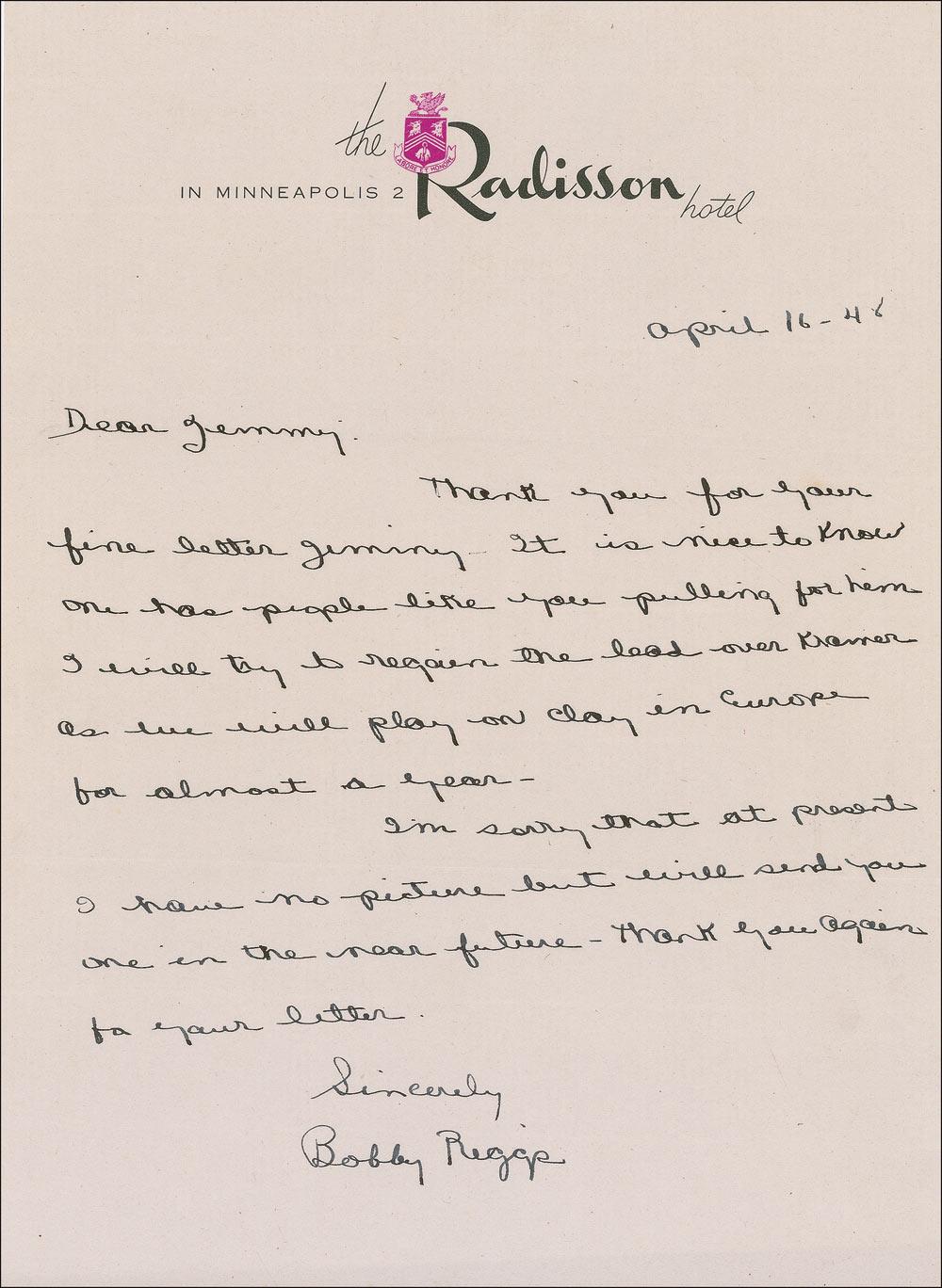 ALS, one page, 7.5 x 10.25, Radisson Hotel letterhead, April 16, 1948. Riggs comments on fellow player Jack Kramer. In part: “It is nice to know one has people like you pulling for him. I will try to regain the lead over Kramer as we will play on clay in Europe for almost a year. I’m sorry that at present I have no picture but will send you one in the near future.” In fine condition, with a few light creases and wrinkles.