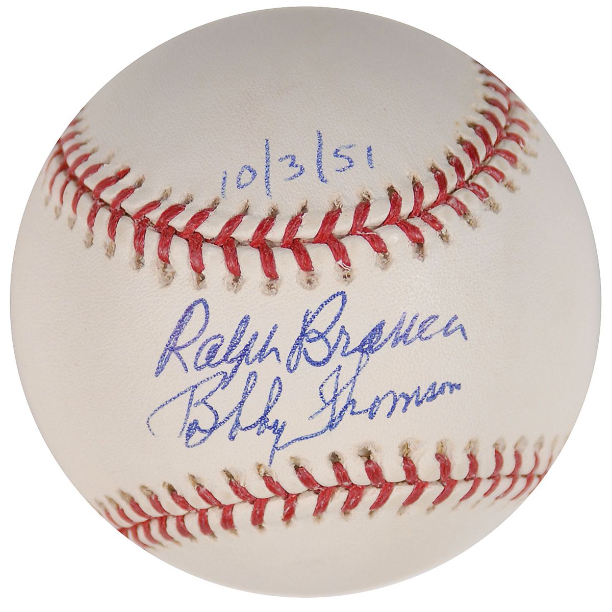 Two items: a McLaughlin-Millard Adirondack baseball bat commemorating the famous ‘Shot Heard ’round the World,’ limited edition of 151, signed on the barrel in black felt tip, “Bobby Thomson, ‘Pennant winning home runs,’” and “‘I should have curved him,’ Ralph Branca”; and an official Rawlings Major League (Selig) baseball, signed on the sweet spot in blue ballpoint by Bobby Thomson and Ralph Branca, with a date notation of October 3, 1951, to the upper panel. In overall fine condition.