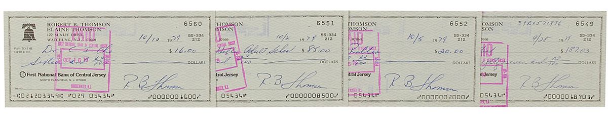 Four personal checks, 6 x 2.75, all filled out and signed by Thomson, “R. B. Thomson,” all dated from 1979. In fine condition, with bank stamps to each check, none affecting the clean signature areas.