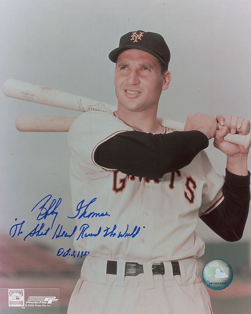 Color glossy 8 x 10 photo of Thomson holding two baseball bats, signed in blue felt tip, “Bobby Thomson, ‘The Shot Heard Round the World,’ Oct. 3, 1951.” In very fine condition.