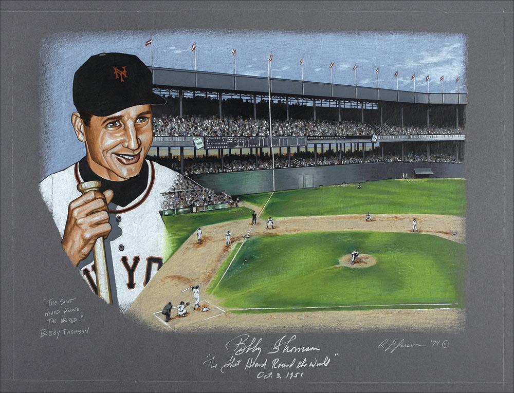 Original composite pastel artwork by R. L. Larson of Thomson and his historic home run, 25.5 x 19.5, signed at the bottom in silver ink, “Bobby Thomson, ‘The Shot Heard Round The World’ Oct. 3, 1951.” Also signed in pencil by the artist. In very fine condition. Pre-certified Steve Grad/PSA/DNA and RRAuction COA.