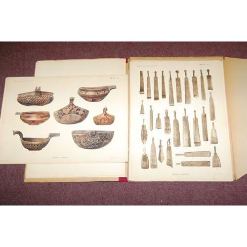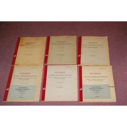 Bobrinsky, Count A.A. {Aleksey Aleksandrovich}. Russian Folk Wooden Carvings - 6 Portfolios. Mockba & Leipzig: Elephant Folio - over 15" - 23" tall. Ex-Library. Good Condition. SCARCE. Text in Russian, with typed English text laid in. Volumes 5, 6, 7, 9, 10 & 11. 107 photographic plates on hard stock ( 2 in color), unbound as issued, in original matching portfolios. Volumes published in Mockba are titled - Narodyja Russkija Dereviannyja Izdielija (vol. 5, 6, 7 & 10). Volumes published in Leipzig have additional title on paper label reading - Volkstumliche Russische Holzarbeiten (vol. 9 & 11). Pencil notations on edge of plates (not affecting the images), library ink stamp on back of plates, portfolios have library tape over backstrip. Volume 7 has some duplicates.