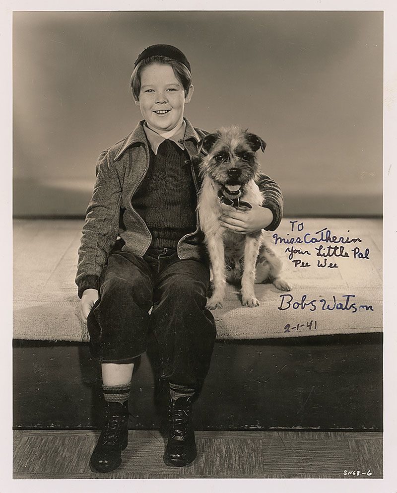 Vintage matte-finish 8 x 10 photo of Watson as he appeared in Men of Boys Town, signed and inscribed in fountain pen “To Miss Catherine, Your little pal, Pee Wee, Bobs Watson,” and dated February 1, 1941. Reverse bears a Clarence Sinclair Bull photographer’s stamp. In fine condition.