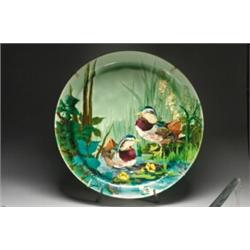 outlined in ochre slip, painted in brightly coloured enamels with ducks on a pond, one or two minor glaze chips to rim, dia. 25.1” — 63.8 cm., painted unidentified signature and B.F.K in green, painted Boch F La Louviere- in blue to the reverse