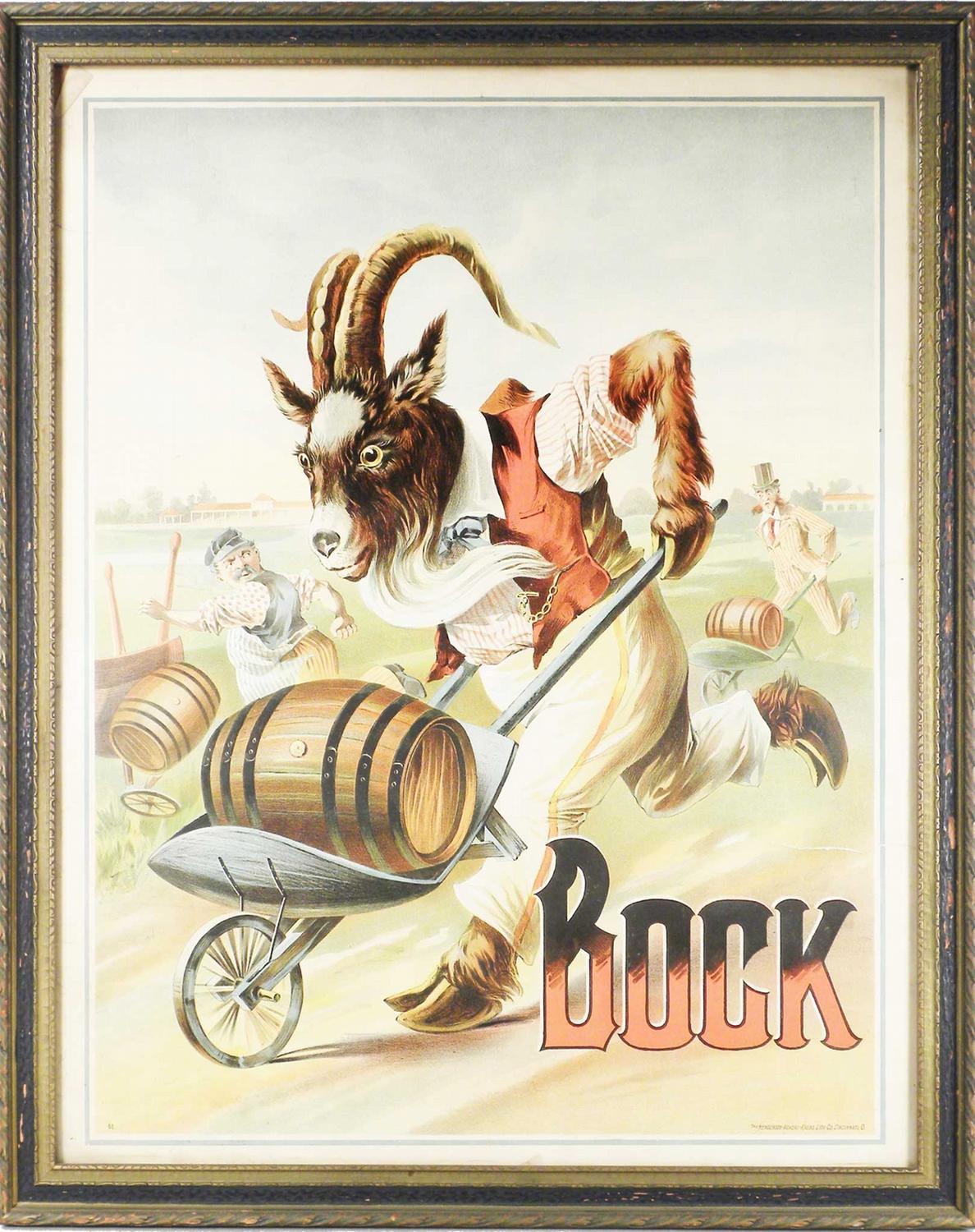 Bock Beer Paper Poster. Depicting the "Ram" winning a wheel barrow race. The Henderson Achert-Krebs Litho Co. Cincinnati, OH. Framed under glass. 4 inch tear at 4:00, 1 inch tear at 10:00, top left corner dog eared otherwise very good condition. 21 1/2 X 27 1/2 inches.