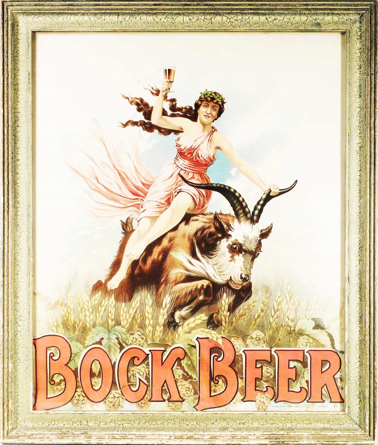 Bock Beer Paper Poster. Depicting Roman Goddess Riding the "Ram". Henderson Achert-Kreb Litho CO. Cincinnati, OH. Framed under glass. Tears at 3/6:00 and staining at 8:00 otherwise good condition. 19 1/2 X 24 inches.