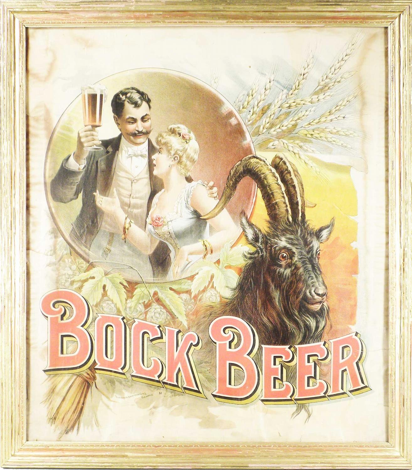 Bock Beer Paper Poster. Depicting Gentleman and his lady in a cameo behind the "Ram". The Henderson Achert-Kreb Litho Co. Cincinnati, OH. Framed under glass. Tears, stains and wrinkles throughout, fair condition. 21 1/2 X 24 3/4 inches.