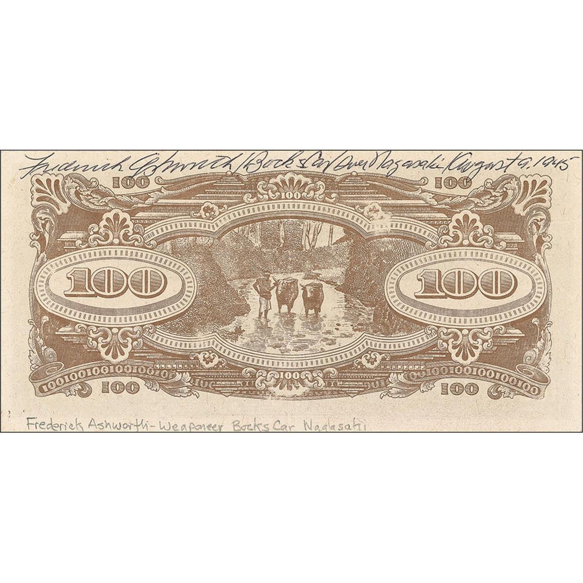 Navy officer who served as the weaponeer on the B-29 Bockscar that dropped the atomic bomb "Fat Man" on Nagasaki, Japan. Japanese occupation 100 dollar note, 6.25 x 3, signed at the top, “Frederick Ashworth/Bock’s Car/Over Nagasaki/August 9, 1945.” In fine condition.