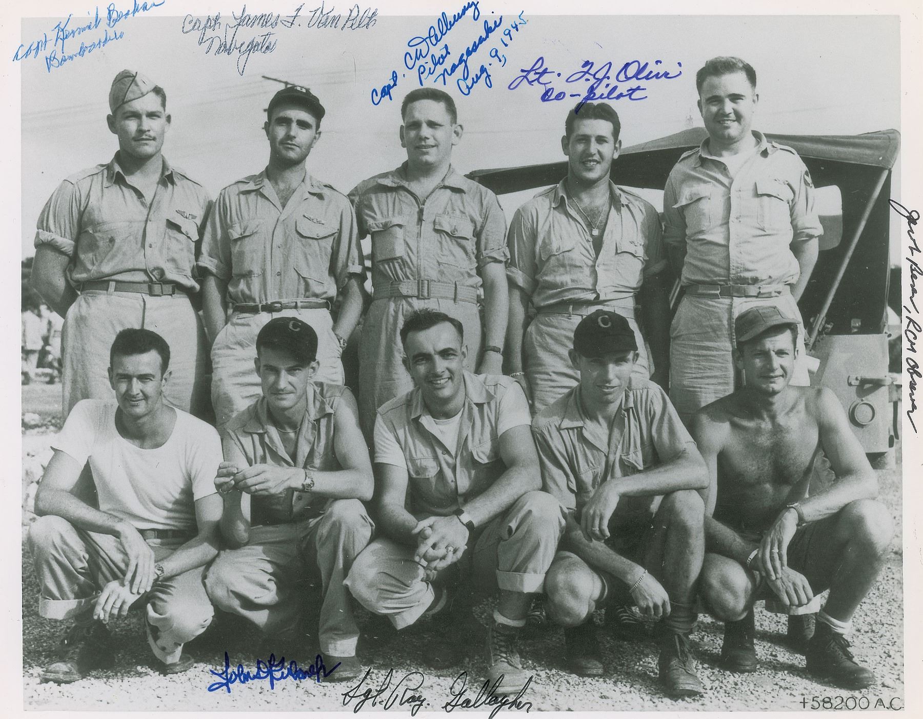Glossy 10 x 7.75 photo of the crew of Bockscar, the U.S. Army Air Forces B-29 bomber that dropped a Fat Man nuclear weapon over the Japanese city of Nagasaki during World War II, signed in ballpoint and felt tip by seven crew members: "Capt. Kermit Beahan, Bombardier," "Capt. James F. Van Pelt, Navigator," "Capt. C. D. Albury, Pilot, Nagasaki, Aug. 9, 1945," "Lt. F. J. Olivi, co-pilot," "Jacob Beser, RCM Observer," "John D. Kuharek," and "Sgt. Ray Gallagher." In fine condition, with light bends to two corners.