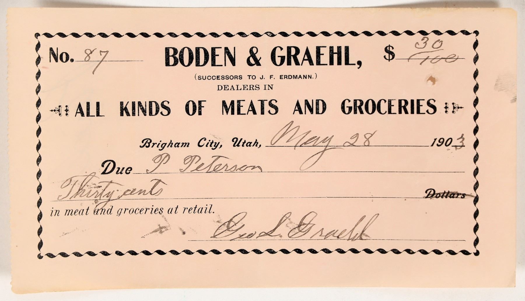Dateline Brigham City, Utah, May 28, 1903. Due P. Peterson 30 cents in meat and groceries. 3.25 x 6"