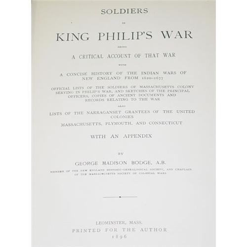 Bodge, George Madison. Soldiers in King Philip's War Being a Critical Account of That War With a Concise History of the Indian Wars of New England From 1620-1677, SIGNED. Leominster, Mass: Printed for the Author, 1896. First Edition. 8vo - over 7¾" - 9¾" tall. Hard Cover. Good Condition. THIS IS NOT AN EX-LIBRARY BOOK. Author's autograph & subscription #251, pasted-in. ALSO Author's SIGNED letter, pasted-in. ALSO ownership name of Ellis B. Usher on ffp, one of the Subscriber's. xiii [1] 502pp in original cloth binding, with binding & hinges tight. Bio of Author, pasted in, from the N.E. Historic Genealogical Society