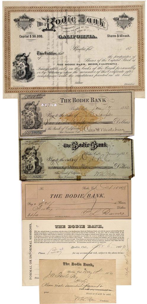 Lot of 6. 1) The Bodie Bank check, dated Feb 15, 1878. Simple brown paper, beige with darker brown horizontal stripes. No check number noted. Edward Bosqui & Co. Printers, S.F. 2) "Buy" order for the San Francisco Stock and Exchange Board, dated Nov. 6, 1879. Order to buy: "10 Utah," signed by Richard Palmer. "Dep Ck # 116" written in pencil along right border. 3) A payment notice dated May 18, 1880. To. J.W. Towles, Esq. The note requests to "Please make immediate payment on your ___ Stock or it will be sold. Signed by (illegible) as cashier. 4) Two checks from the Brodie Bank, datelined Bodie, Cal. Check No. 8926 for $27.30 is dated 1880, and is printed on light green paper. Paid to the order of D.A. Rice, with W. Pope signing as Cashier. Check No. 19252 for $250 is dated 1882, and is printed on paper with vertical light brown stripes. Pay to the order of D.E. Simpson, signed by Geo. H. Winterburn as Cashier. Each has an orange RN-G1 revenue stamp imprint centered. 5) The Bodie Bank stock certificate. Incorporated under the laws of the State of California. Blank, datelined Bodie, Cal., 187_. Brown border and black print. Printer: Ezra A. Cook & Co. Chicago. No foldlines, extremely fine.