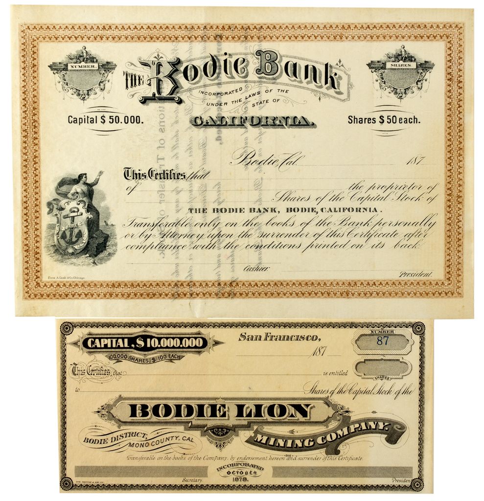 Lot of 2. 1) The Bodie Bank stock certificate. The Bodie Bank was the major financier of the mining companies as well as the general population of the town. Incorporated under the laws of the State of California. Blank, datelined Bodie, Cal., 187_. Brown border and black print. Printer: Ezra A. Cook & Co. Chicago. No fold lines, extremely fine. 2) Bodie Lion Mining Company Stock Certificate Number 87, Bodie, District, Mono County, California. Incorporated in 1878. One of the many mines on the Bodie Bluff with their corporate office in San Francisco. Fine condition. -58775