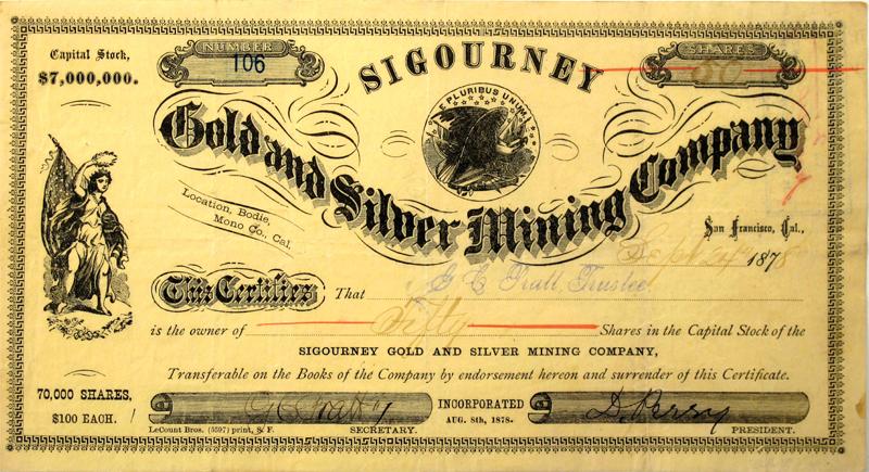 Bodie,CA - Mono County - September 24 1878 - Sigourney Gold and Silver Mining Company Stock Certific