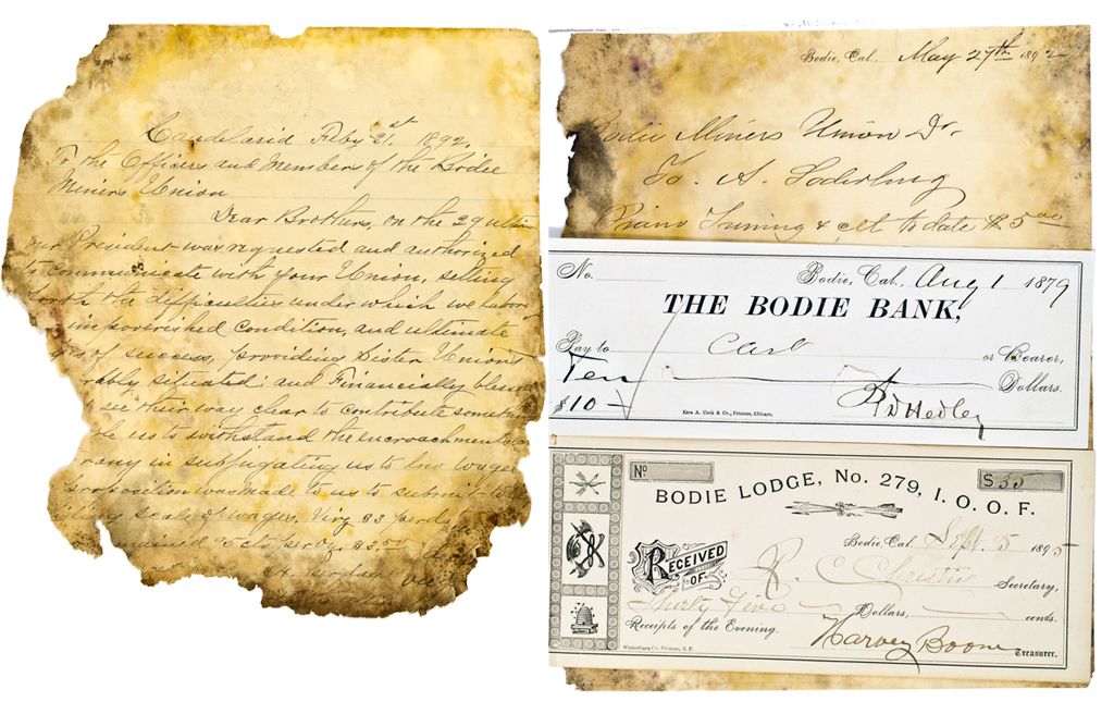 Lot of four pieces, which include: A Bodie Bank check dated 1879, for $10; Bodie I.O.O.F. Receipt dated 1895 and signed by Treasurer Harvey Boom; Bodie invoice for piano tuning for the Bodie Miners Union, dated 1892; a partial notice to the officers and members of the Bodie Miners Union, datelined Candelaria, February 21, 1892. This piece is badly damaged, partially burned and only the middle part of one page is extant and readable. Likewise, the piano tuning invoice is also badly damaged by water and burned on the left margin. The I.O.O.F. Receipt and check are both excellent.City: BodieCounty: Mono CountyState: CA