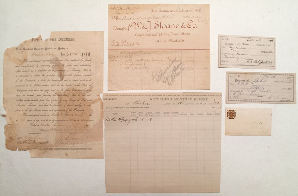 Lot of six. 1) Bodie Knights Templar Calling Card used by Alex Bock at Triennial Concave in 1883. 2) 1898 Lodge of Free and Accepted Masons. Application for William Dowling Davidson signed by J. S. Cain. 3) 1894 invoice for carpet from San Francisco to the Bodie Lodge #279 of the IOOF. 4) 1883 IOOF monthly report signed by Silas B. Smith. 5) Receipt for the IOOF in 1895. 6) IOOF Hall Rent Receipt form 1899. (Ames Collection)