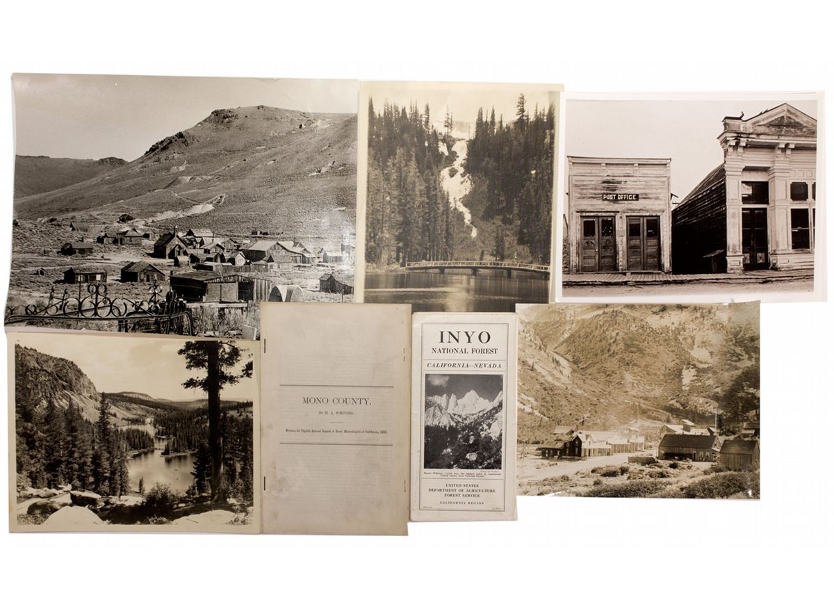 Lot of 18: photographs, a map and California state mineralogist report pertaining to Mono County. The collection includes a 9.5" x 7.5" c1920 photo of the ghost town, Bodie, California, post office and bank and several other old photos that depict natural wilderness and scenes from within Mono County and the surrounding area, including: three smaller magazine clipping photographs of Bennettville, CA (c1886); Lundy, CA (c1884); and middle town Masonic, CA (formerly Lorena). Photos of Bodie are 13" x 10", two 16" x 6" murals and two 4" x 3" c1961 photos. There also are two c1959 photos of Tioga (Bennettville), along with a description of the ghost town that is now under the waters of Lundy Lake. There also is a 6" x 8" photo of Colonel Price's Inn in Oasis, CA and a 7.5" x 9" photo of Lundy, CA. Documents include a 1935 map of Inyo National Forest, an 1895 U.S. Coast and Geodetic Survey Report - a survey map of the boundary between California and Nevada, a 49-page Eighth Annual Report of State Mineralogist of California on Mono County, by H. A. Whiting c1888, and Bodie Trail "Pee Card" coupons. -59285