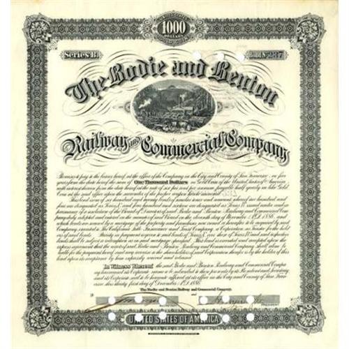 Beautifully engraved RARE certificate from the Bodie and Benton Railway and Commercial Company issued in 1886. This historic document has an ornate border around it with a vignette of a log mill site and railroad. This item is hand signed by the Company?s President ( Henry Marvin Yerington ) and Secretary ( Thomas Menzies ) and is over 121 years old. Punch cancellation through signatures. EF+. Listed in Cox at $2,000.