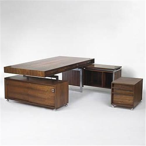 Bodil Kjaer<BR>executive desk suite<BR>Denmark, c. 1960<BR>rosewood, stainless steel<BR>79"w x 29.5"d x 28.5"h<BR>return: 54"w x 18"d x 24"h<BR>cabinets: 24"w x 17.25"d x 19.5"h and <BR>48.5"w x 17.25"d x 19.5"h<BR><BR>Literature: Nilufar: Why, Yashar, ppg. 150-151<BR>Provenance: Nilufar, Milan<BR>Private collection