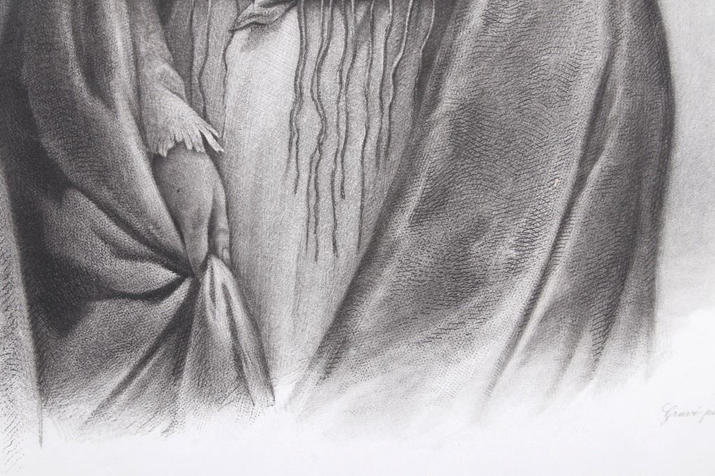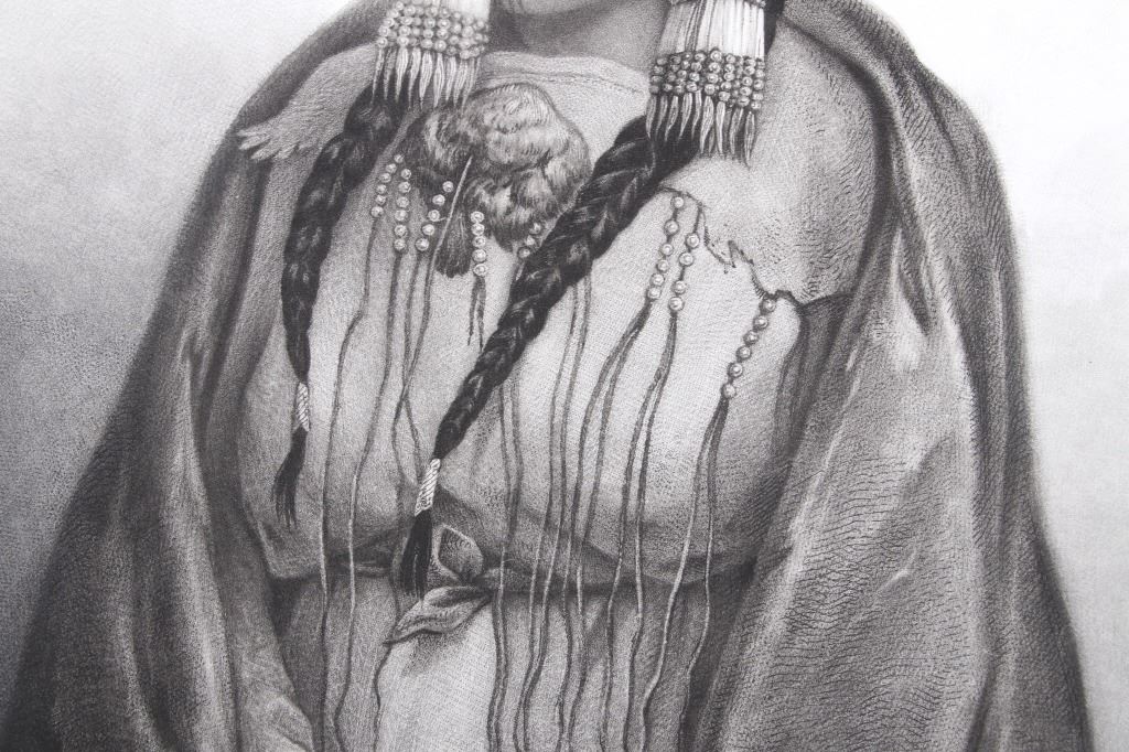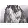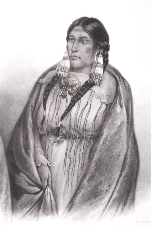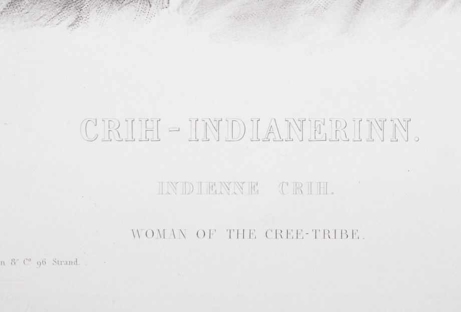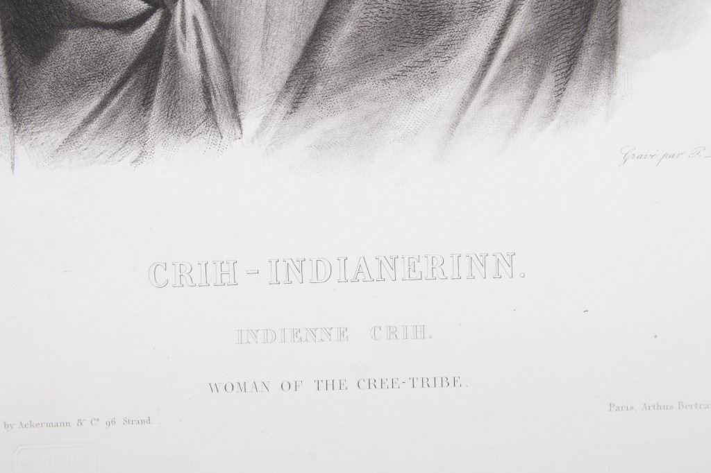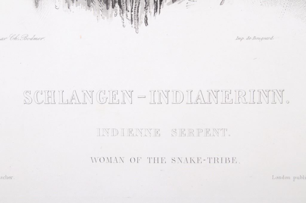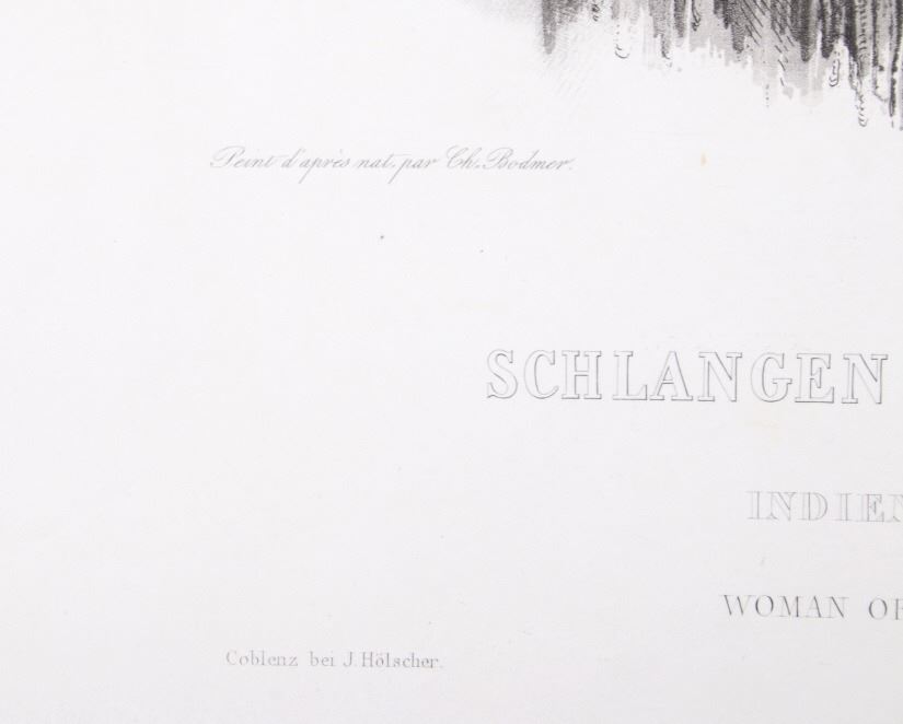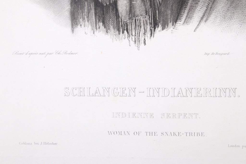Featured in this lot is this aquatinted etching called "Woman of the Snake-Tribe & Woman of the Cree-Tribe," by artist Karl Bodmer born 1809 and died 1893 and shows the blind stamp centered at the bottom of the eatching with plate number Tab. 33. The etching shows two women from two different tribes Schlangen-Indianerinn as the Woman of the Snake-Tribe, and Crih-Indianerinn as the Woman of the Cree-Tribe. The woman are adorned with traditional garments with bead work and hide construction of the garments with the Cree woman wearing swooping beaded earrings. The etching reads as follows: Peint d'apres nat par Ch. Bodmer - Imp. de Bougeard - Grave par P. Legrand - Schlangen-Indianerinn - Crih-Indianerinn - Indienne Serpent - Indienne Cree - Woman of the Snake-Tribe - Woman of the Cree-Tribe - Coblenz bei J. Holscher - London published by Ackermann & Co. go 96 Strand - Paris Arthus Bertrand editeur. This is a free etching without a frame. Johann Carl Bodmer was a Swiss-French printmaker, etcher, lithographer, zinc engraver, draughtsman, painter, illustrator and hunter. Known as Karl Bodmer in literature and paintings, as a Swiss and French citizen, his name was recorded as Johann Karl Bodmer and Jean-Charles Bodmer, respectively. The condition of this etching is good with slight wear to the outside edge of the etching with some discoloration to the area closest to the edge of the etching. The measurements of this etching is 18 1/8" x 25". Provenance: From the renowned Sundog Fine Art Bozeman, Montana collection and collected by Bruce VanLandingham. Bruce VanLandingham was a pillar in the American Indian collecting community and a respected expert. Along with being an avid collector, Bruce also was the sole owner of Sundog Fine Art Gallery in Bozeman, which was both part museum and gallery. Identification#: E1102.