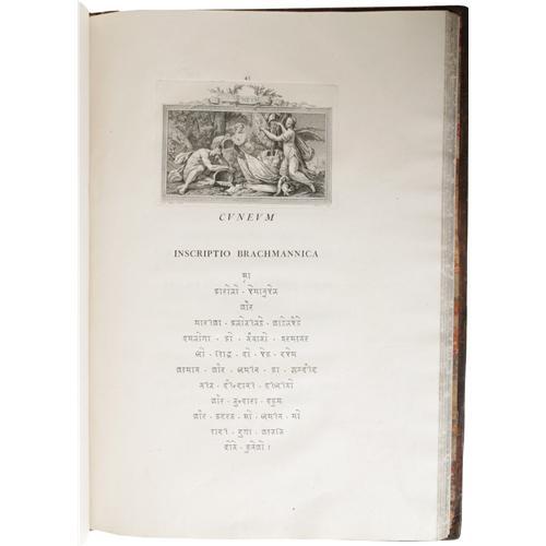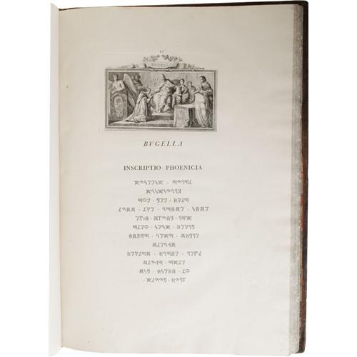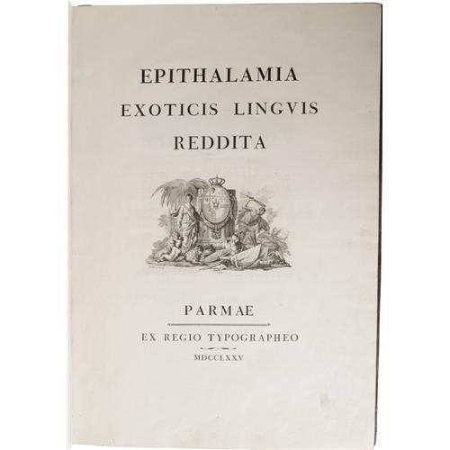 <B>Giovanni Battista Bodoni Johannes Baptista Bodonius :<I> Epithalamia Exoticis Linguis Reddita.</B></I></B></I> (Parma: Ex Regio Typographeo, 1775), first edition, state "b" with the poem by Conte Della Torre di Rezzonico, 124ff, engraved title page vignette, engraved head and tail pieces by Ferrari, full polished calf with thin triple rule gilt borders on front and rear boards, seven spine compartments between raised bands, gilt-tooled ornamentation in six compartments, red morocco spine label with gilt titles, marbled endpapers, elephant folio (13.25" x 19"), a splendid example of this beautiful work with indications of a previous spine repair, else a wonderfully clean, bright interior and in near fine condition.<BR><BR>A simply beautiful book and a classic example of the art of typography. Certainly one of the finest specimen books containing examples of twenty-five exotic languages including Coptic, Phoenician, Hebrew, Tibetan, et al. Giovanni Bodoni (1740-1813) was an Italian publisher, printer, engraver, and typographer. He is the designer of the "Bodoni" typeface and was responsible for many technical refinements in printing that allowed him to faithfully reproduce letterforms with very thin lines, in sharp contrast to the thicker lines constituting the main stems of the characters. Bodoni was appointed printer to the court of Parma in 1768. The present work on offer must surely be regarded as one of his better efforts.<BR><BR><b>Shipping:</b> Books & Catalogs (<a target="_blank" href="http://www.heritageauctions.com/common/shipping.php">view shipping information</a>)