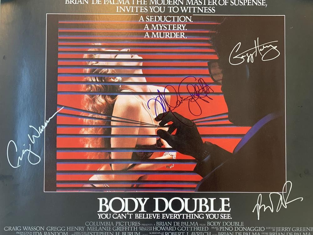 Body Double singed movie poster autographed by Craig Wasson, Melanie Griffith, Gregg Henry and Brian De Palma. 22x28 inches