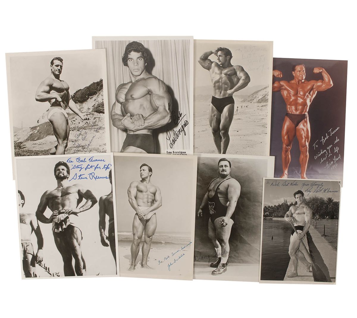 Eight glossy photos, one color, 6 x 8.5 to 8 x 10, each signed in ballpoint or ink by the bodybuilder pictured. Signers include: Steve Reeves, Reg Park (ins), Clarence Ross (ins), Lou Ferrigno (ins), Doug Hepburn, George Eiferman (ins),and John Farbotnik. In overall fine condition, with light creases to few photos.