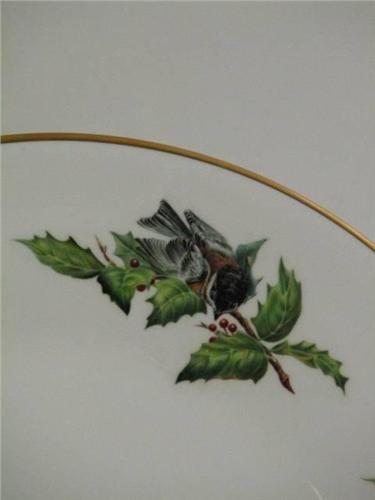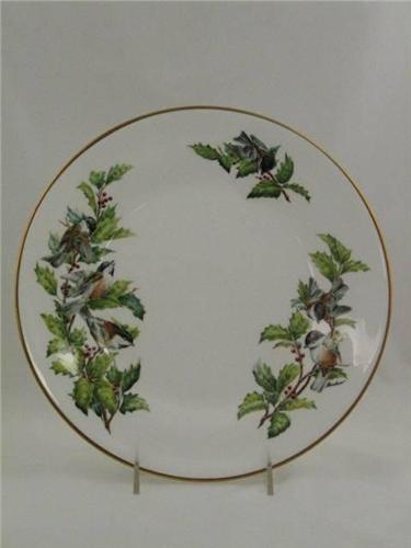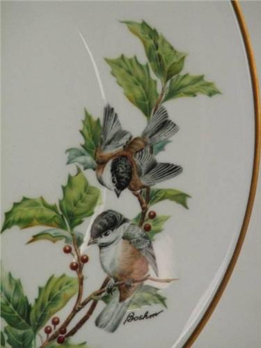Boehm Chickadees and Holly Decorator Plate with gilt edge. Signed on Front: "Boehm". Marked on Back: Boehm Chickadees and Holly, Fine Bone Porcelain, Made in England". Excellent Condition. Dimensions: 10.75"D