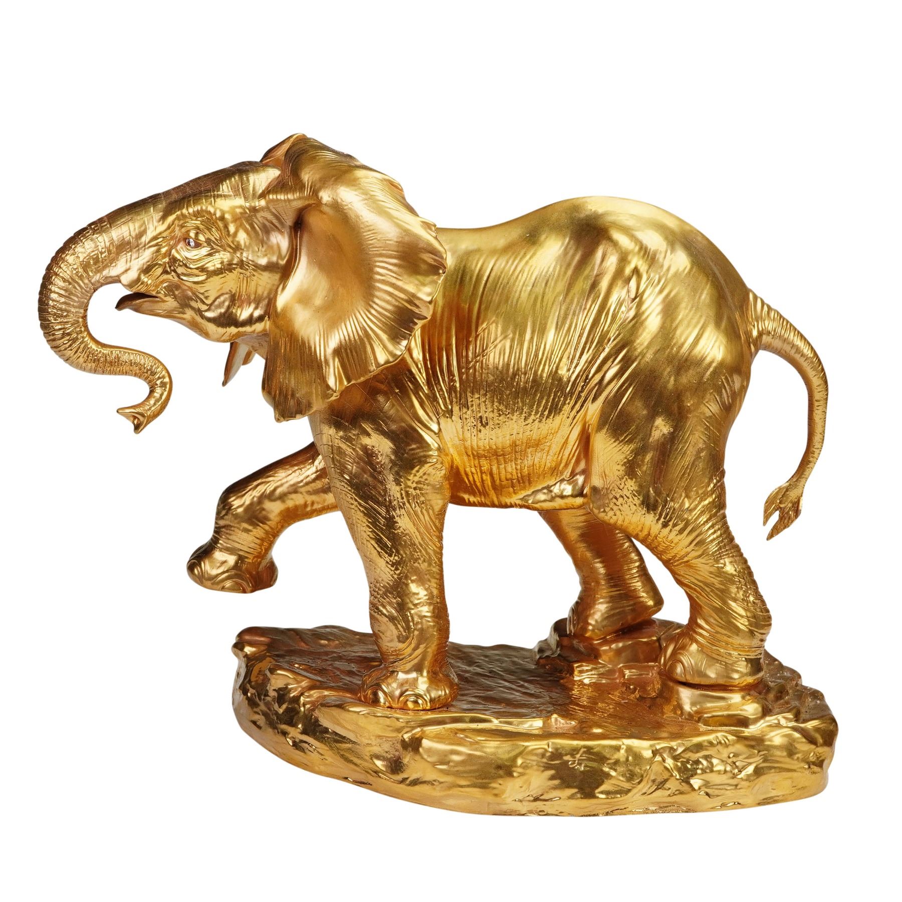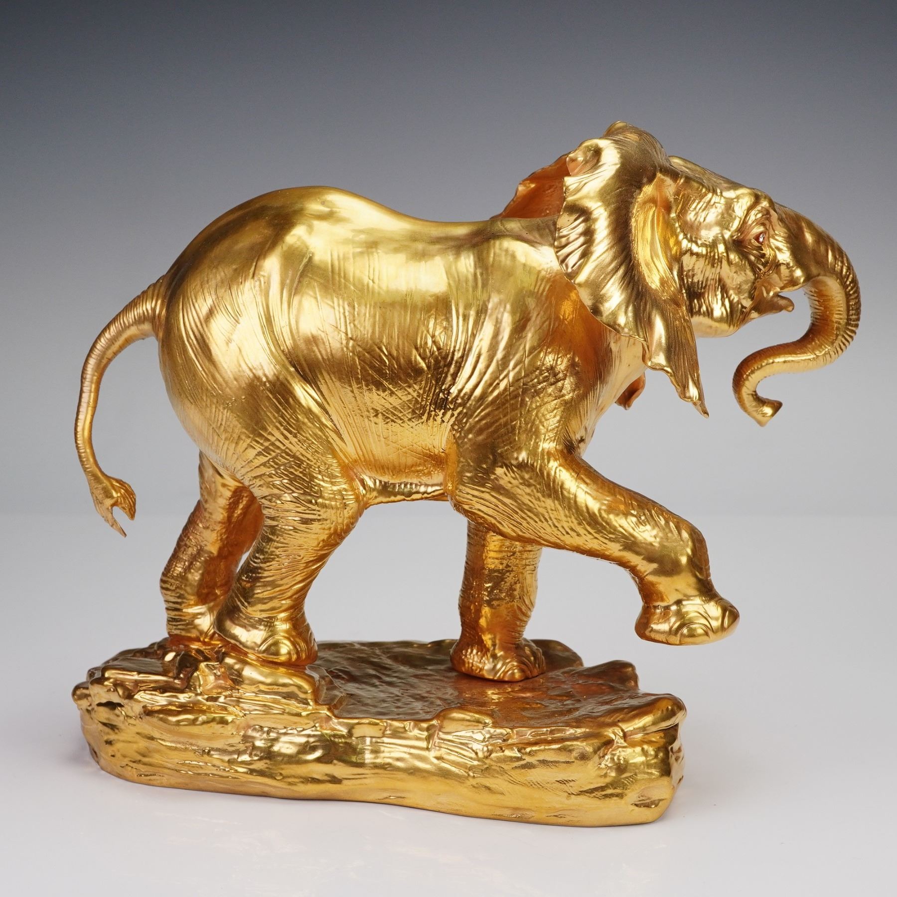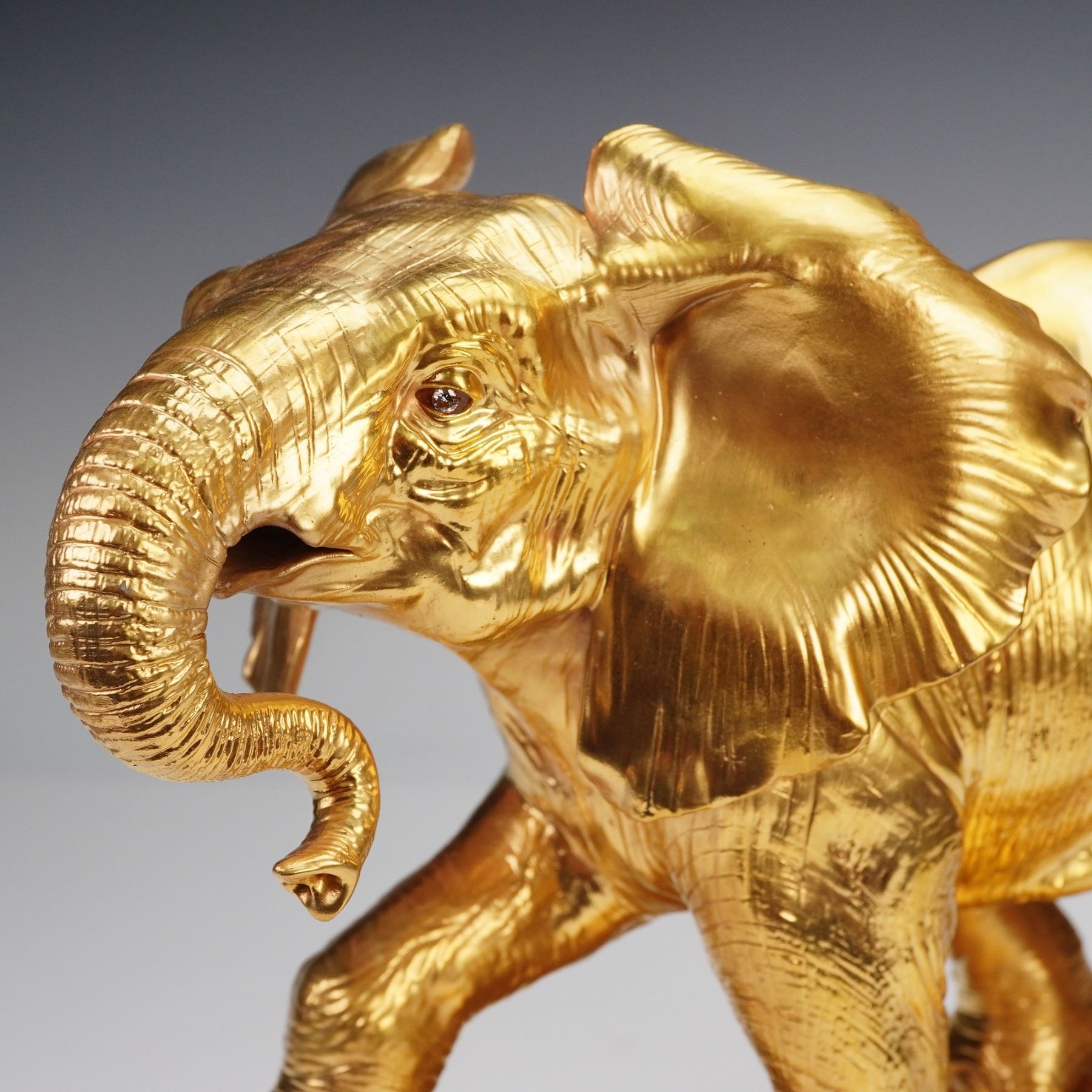 A limited edition, numbered 171, porcelain elephant embellished with 1/10 ct diamond eyes and fired with 24k gold. Depicts a highly detailed elephant in a playful posture, atop a gilded, stylized base. Boehm backstamp.