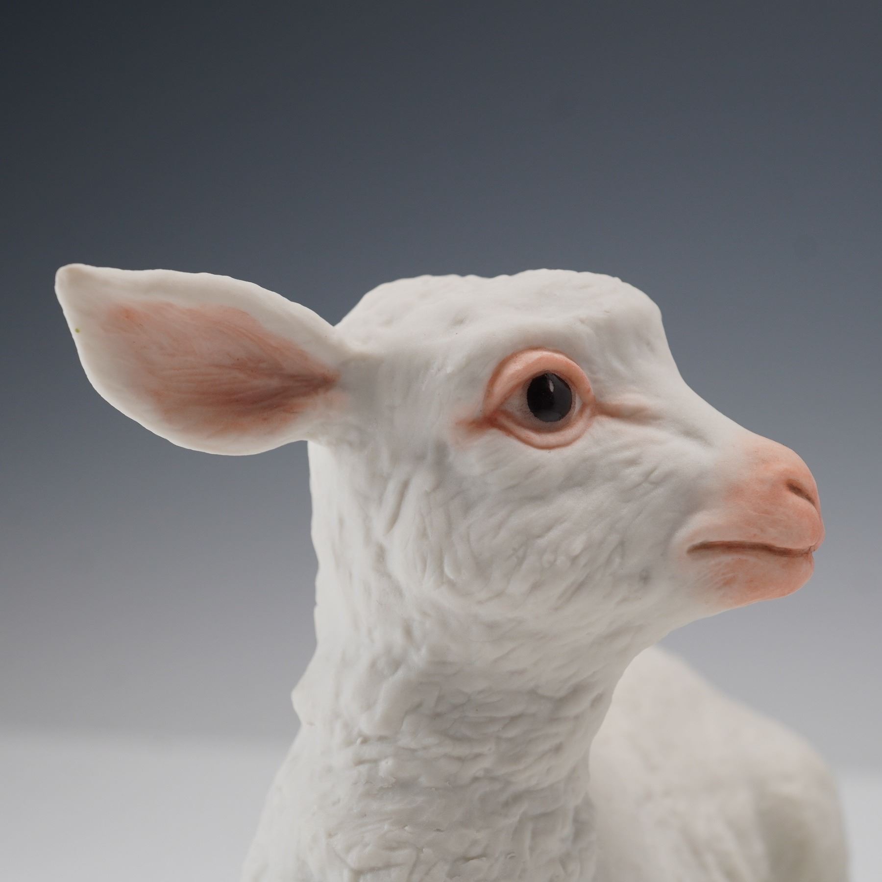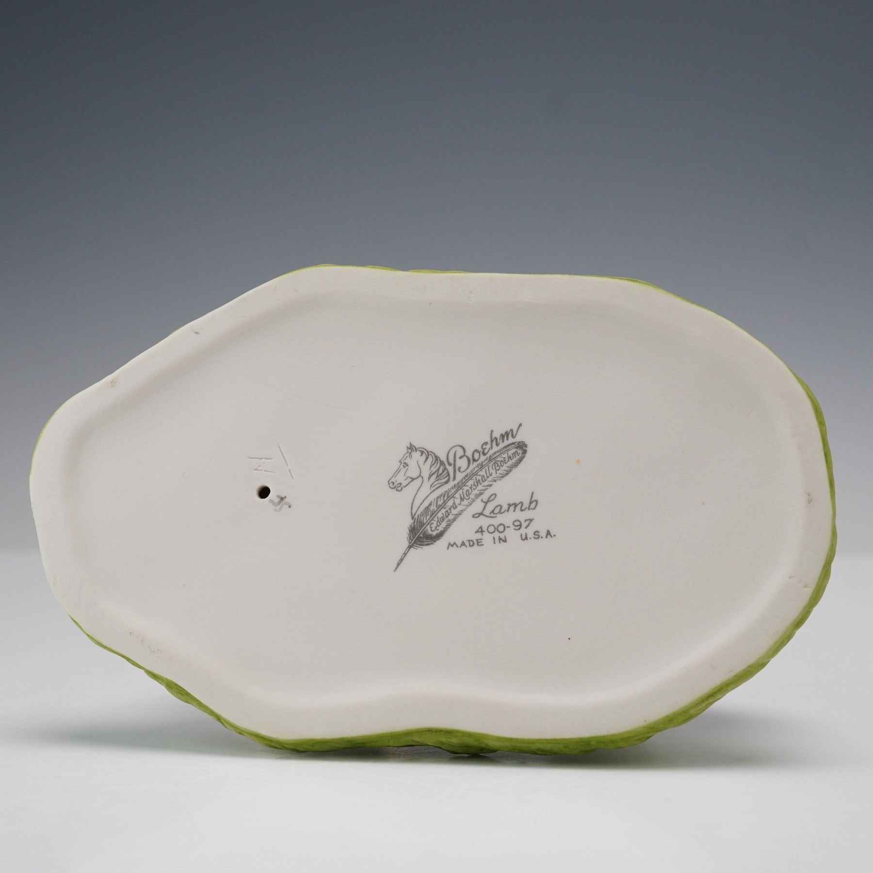This Boehm porcelain figurine, titled Lamb (Model 400-97), depicts an adorable, lifelike lamb lying on a grassy base. The intricate detailing of its soft, woolly fur, large eyes, and gentle expression showcases Boehm's exceptional craftsmanship. The base is marked with the Boehm logo, Lamb, and Made in U.S.A. This charming figurine makes a perfect addition to any collection of animal-themed porcelain.