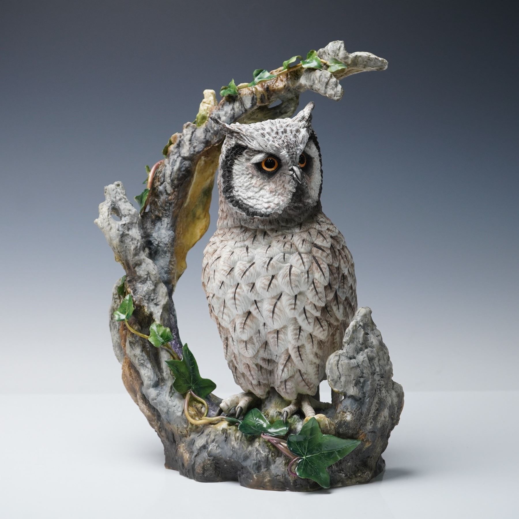 An exceptional Boehm porcelain figurine depicting the elusive White Faced Scops Owl, perched confidently upon a gnarled branch entwined with ivy. The owl's piercing amber eyes and sharply defined facial disc are rendered with incredible realism, while the finely hand-painted plumage in gray, buff, and white captures the layered texture of its feathers. Resting within a naturalistic branch that curves around the figure, this composition embodies both strength and elegance. A testament to Boehm's mastery in wildlife porcelain, this piece is highly sought after by collectors of rare limited editions. Marked Boehm on the base and stamped underside with Boehm crest, Bone Porcelain, Made in England, Limited Edition.