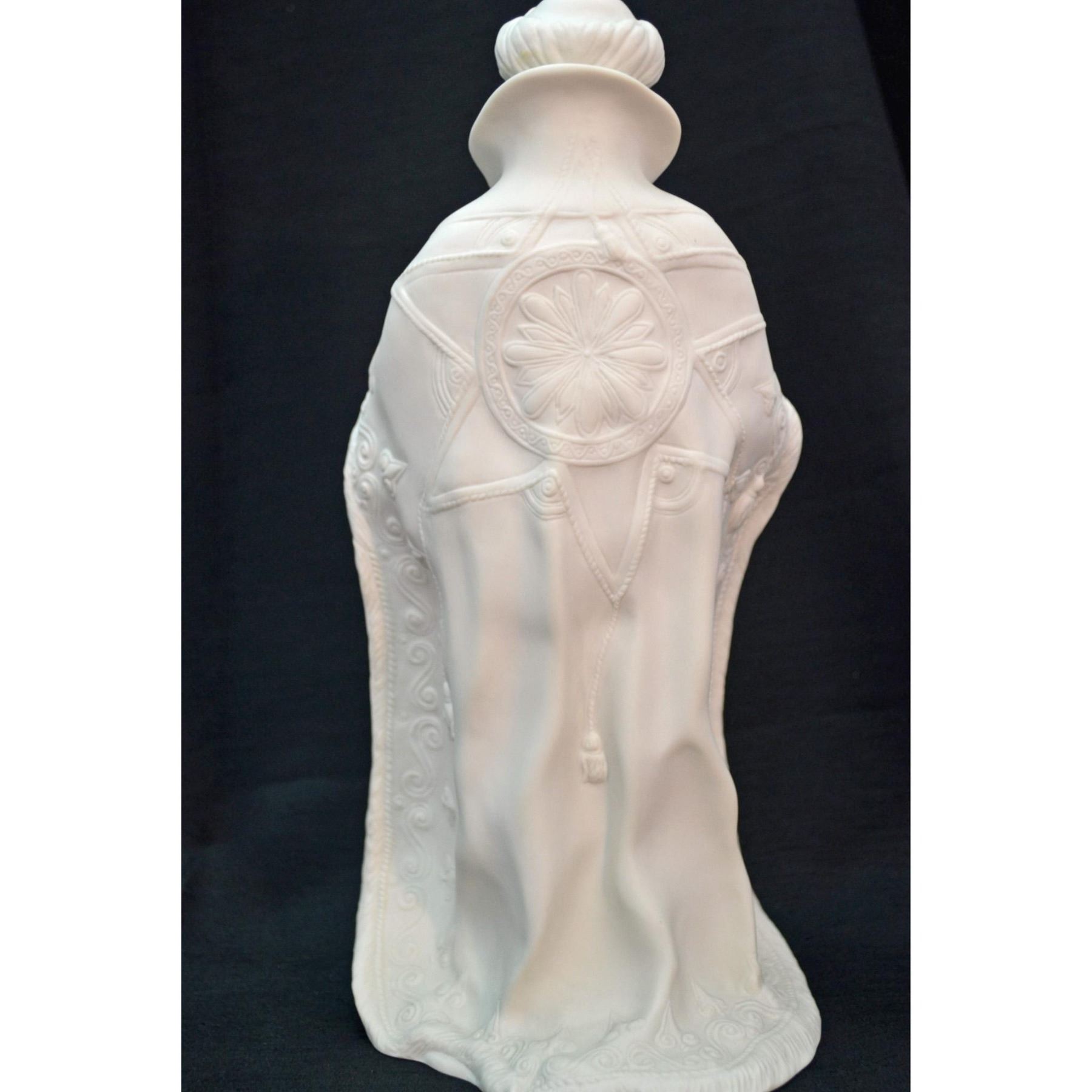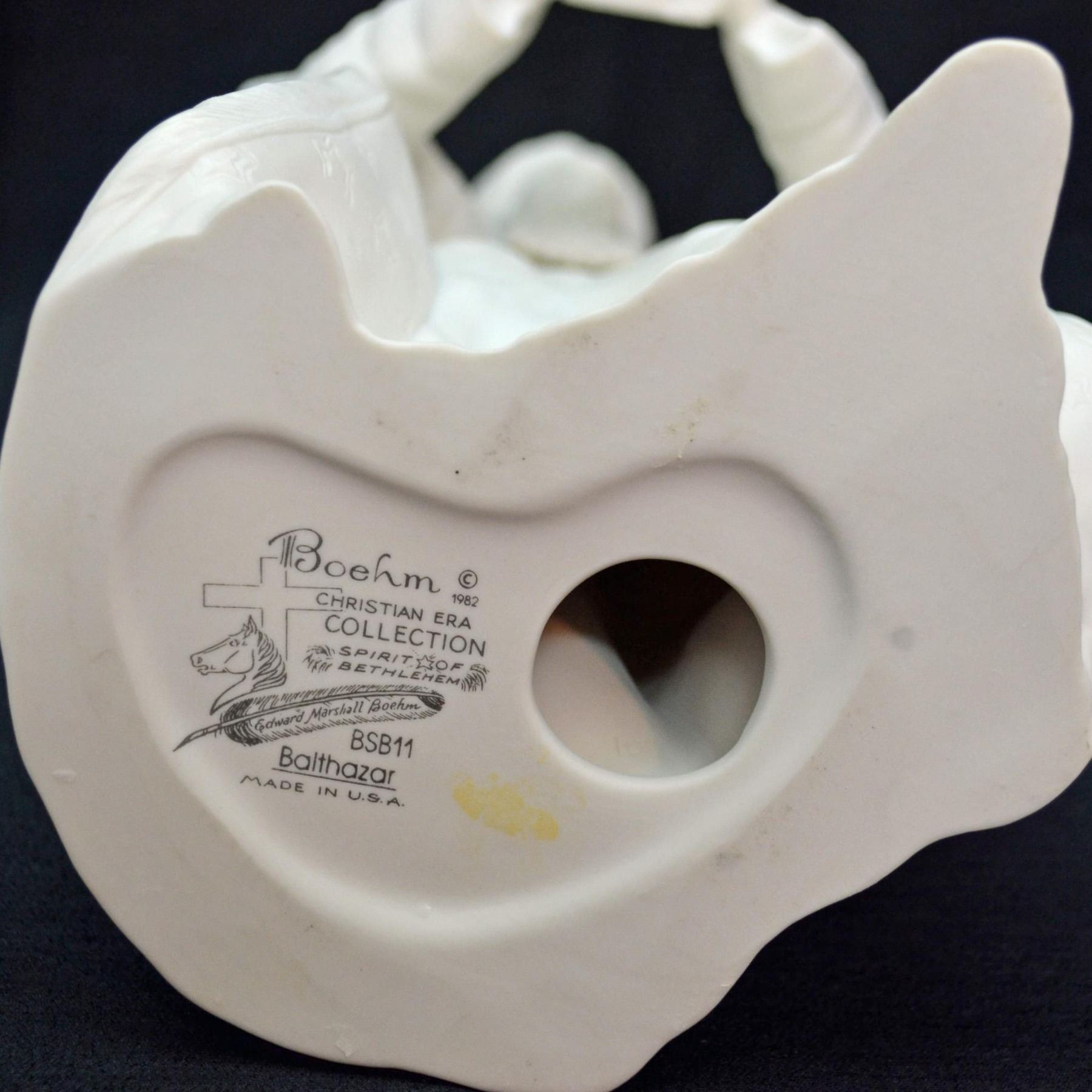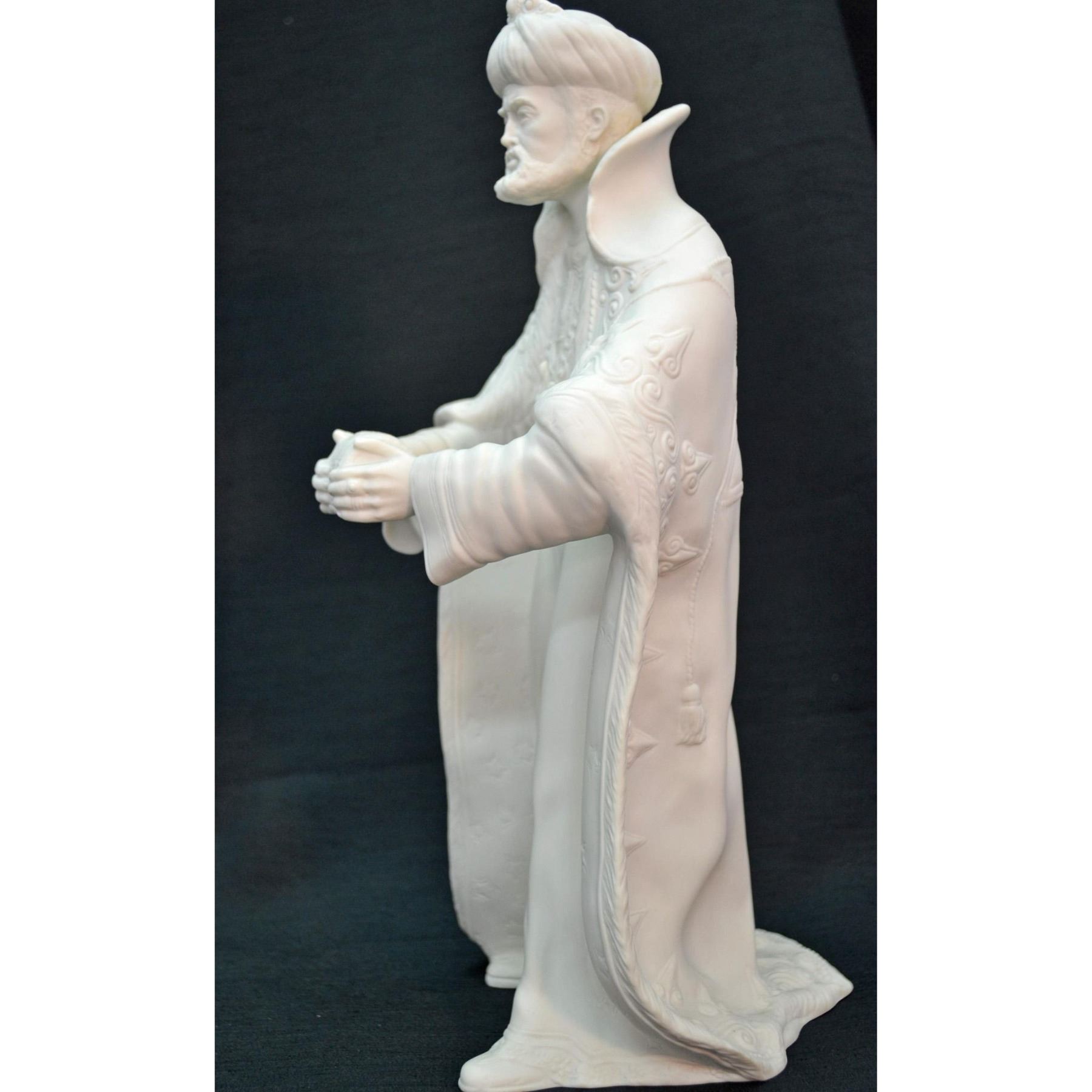 Bisque Porcelain White, hand created, hand crafted by the Artists of the Boehm Studio in the USA. Featuring King Balthazar from the Nativity Set, The Spirit of Bethlehem in Bisque White. Fine detail, very realistic in form and style. Made in the USA. Introduced in 1982. Hallmark: BSB-11. Authentic Boehm Hallmark on the underside. From the Archival Collection of Re Vann Galleries, G.Reasoner, Owner.