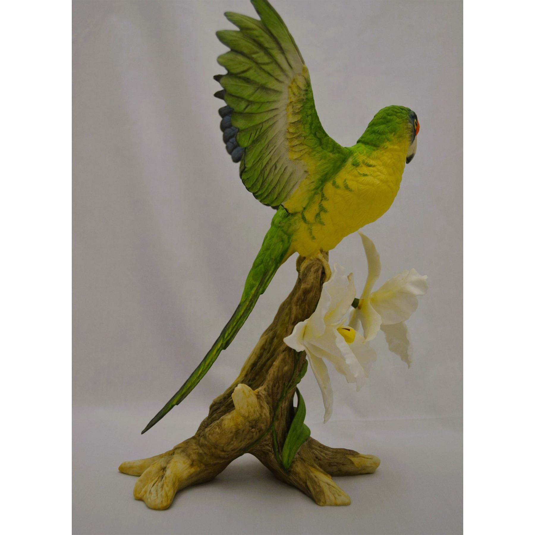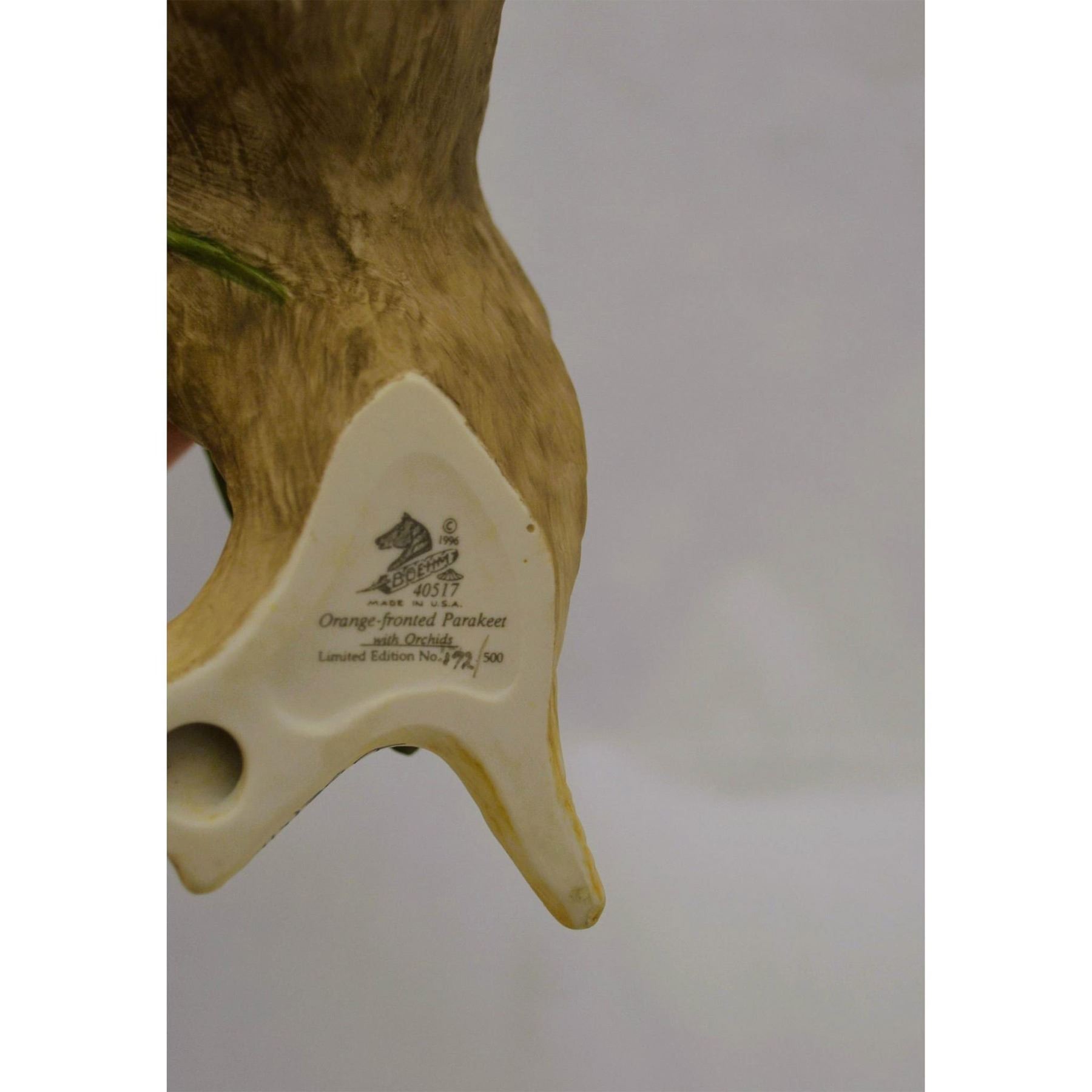 Bisque Porcelain Decorated, hand created, hand painted by the Boehm Studio Artists, featuring the Orange-fronted Parakeet with White Orchids. Edition: 500. this is #172/500. Issued: 1982. Hallmark: 40517 . A remarkable work of art, very realistic with fine detail, design and creativity. Truly Museum Quality Porcelain, at it's best. Authentic Boehm Backstamp on the underside. Size: 7 "L x 8 1/2"W x 12"H. From the Archival Collection of Re Vann Galleries, G.Reasoner, Owner.