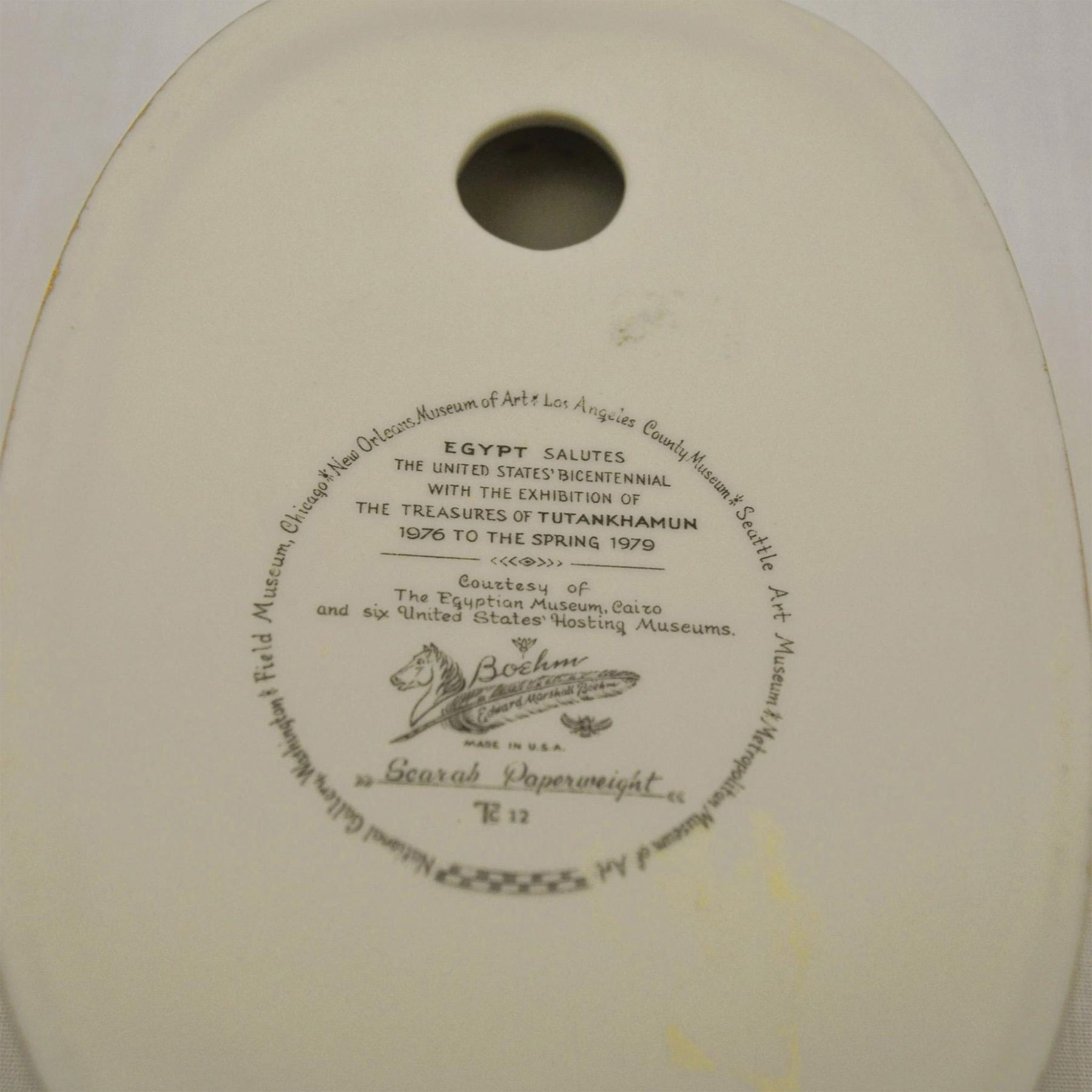 Glazed Porcelain Decorated, hand created, hand painted by the Boehm Studios in the USA. Hallmark: TC-12 . Introduced in 1977, A sold out Edition, Featuring The Scarab Paperweight from the most popular and sought after King Tut, (Tutankhamun) Collection. Fine detail, great coloration and realism, which Boehm is known for Internationally. This Paperweight sculpture has an Authentic Boehm Backstamp on the underside. Excellent Condition. From the Archival Collection of Re Vann Galleries, G.Reasoner, Owner.