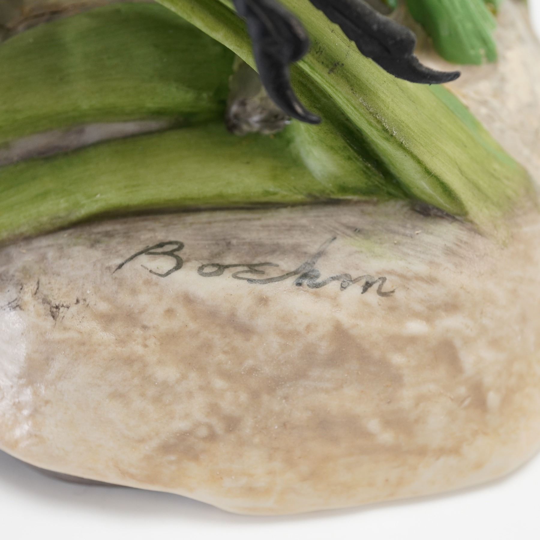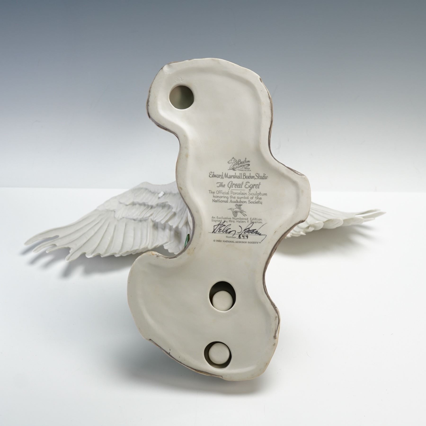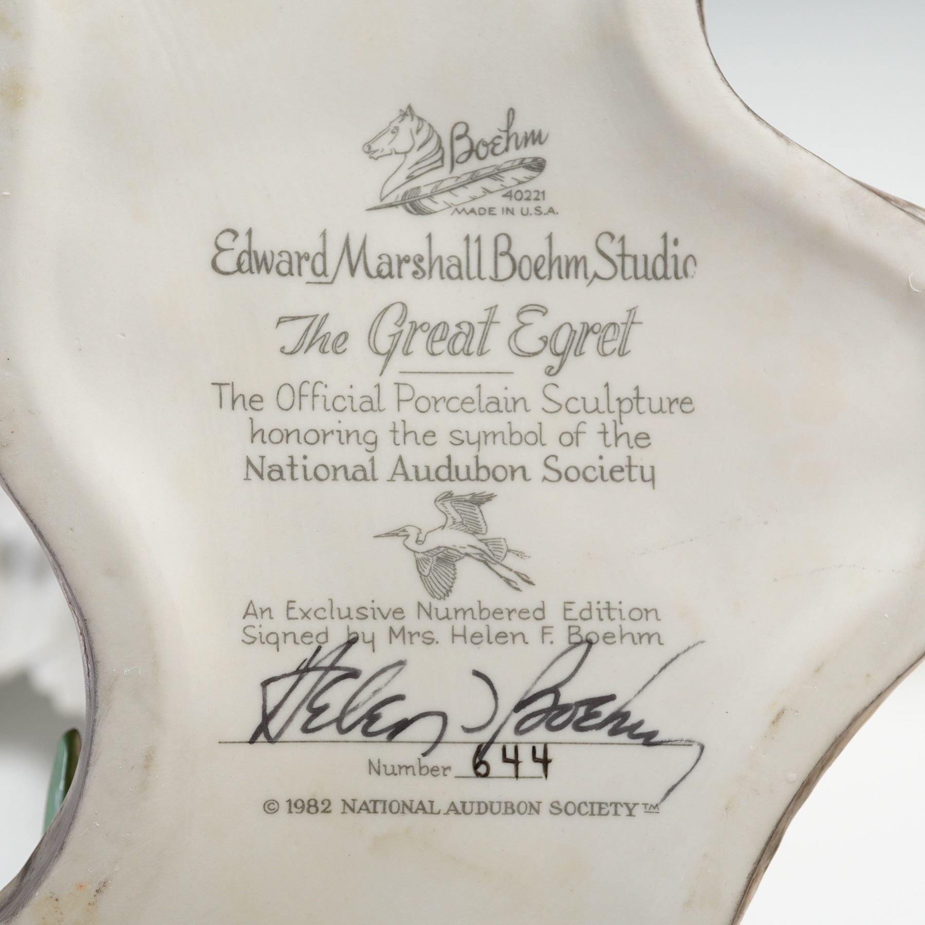 An exclusive numbered edition, this is no. 644. Edward Marshall Boehm Studio piece that captures a great egret in flight above marsh grasses, rendered in fine hand-painted detail. It was produced as "The official Porcelain Sculpture honoring the symbol of the National Audubon Society." Boehm stamped to the side of the base. Signed by Helen F. Boehm to the underside. Boehm Made in U.S.A backstamp.