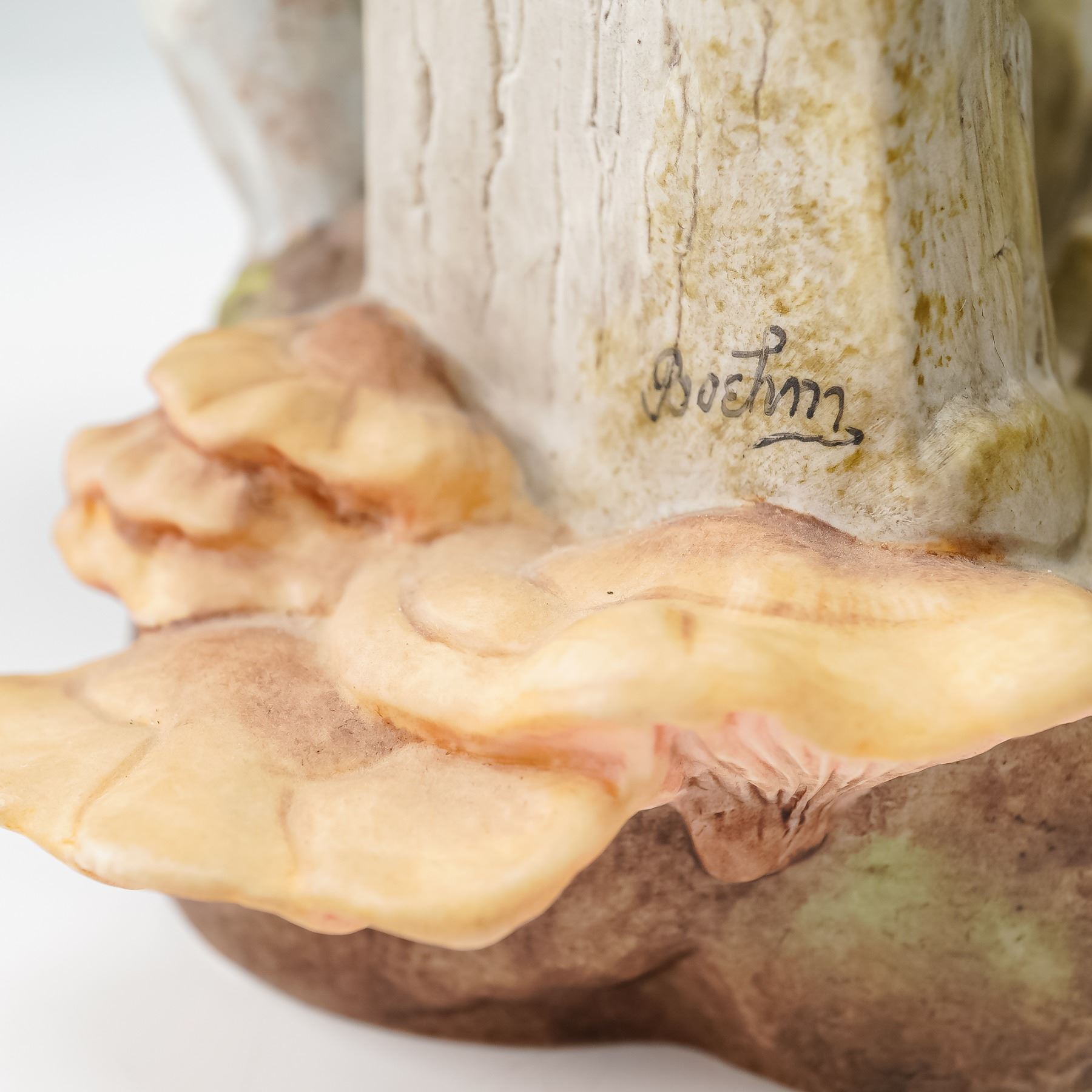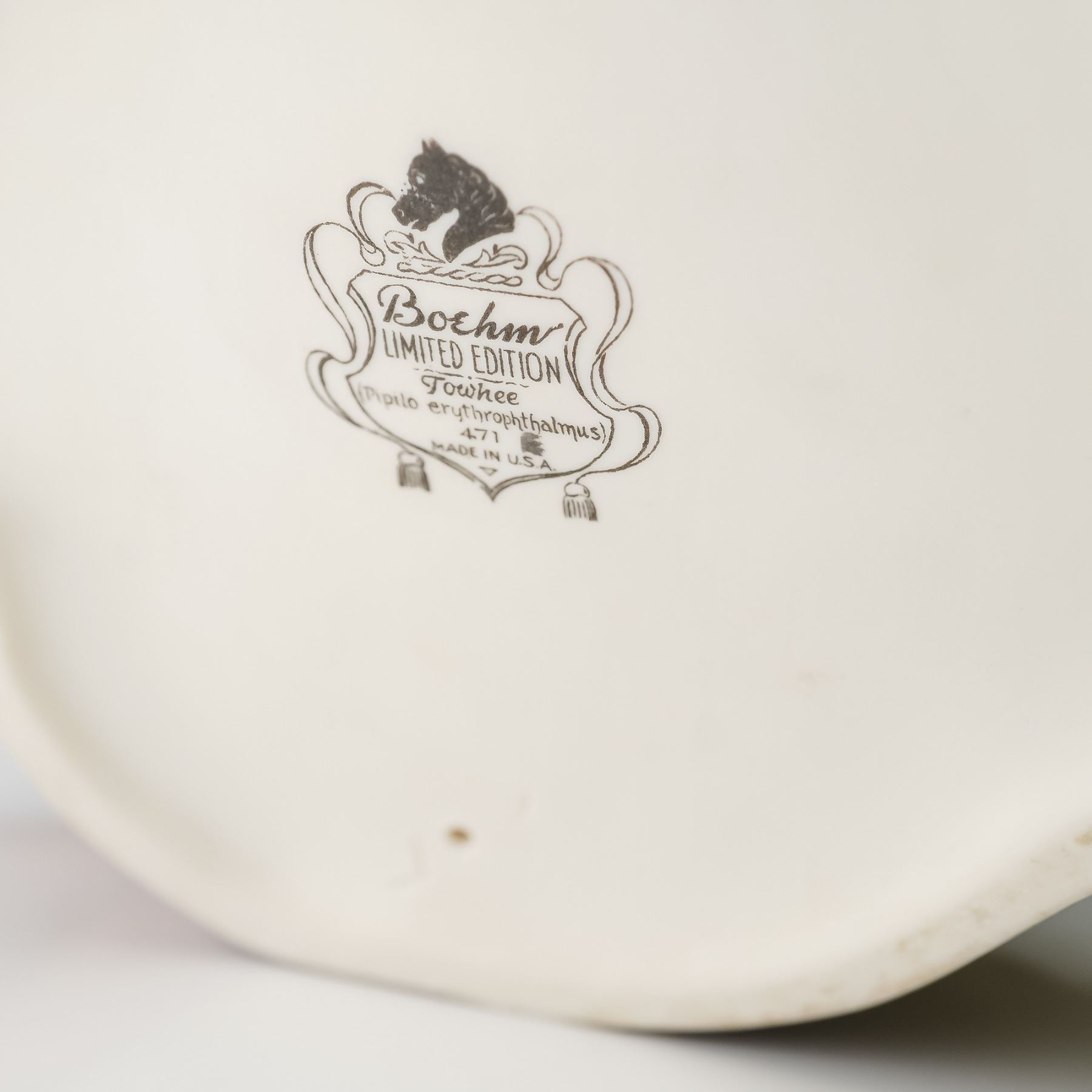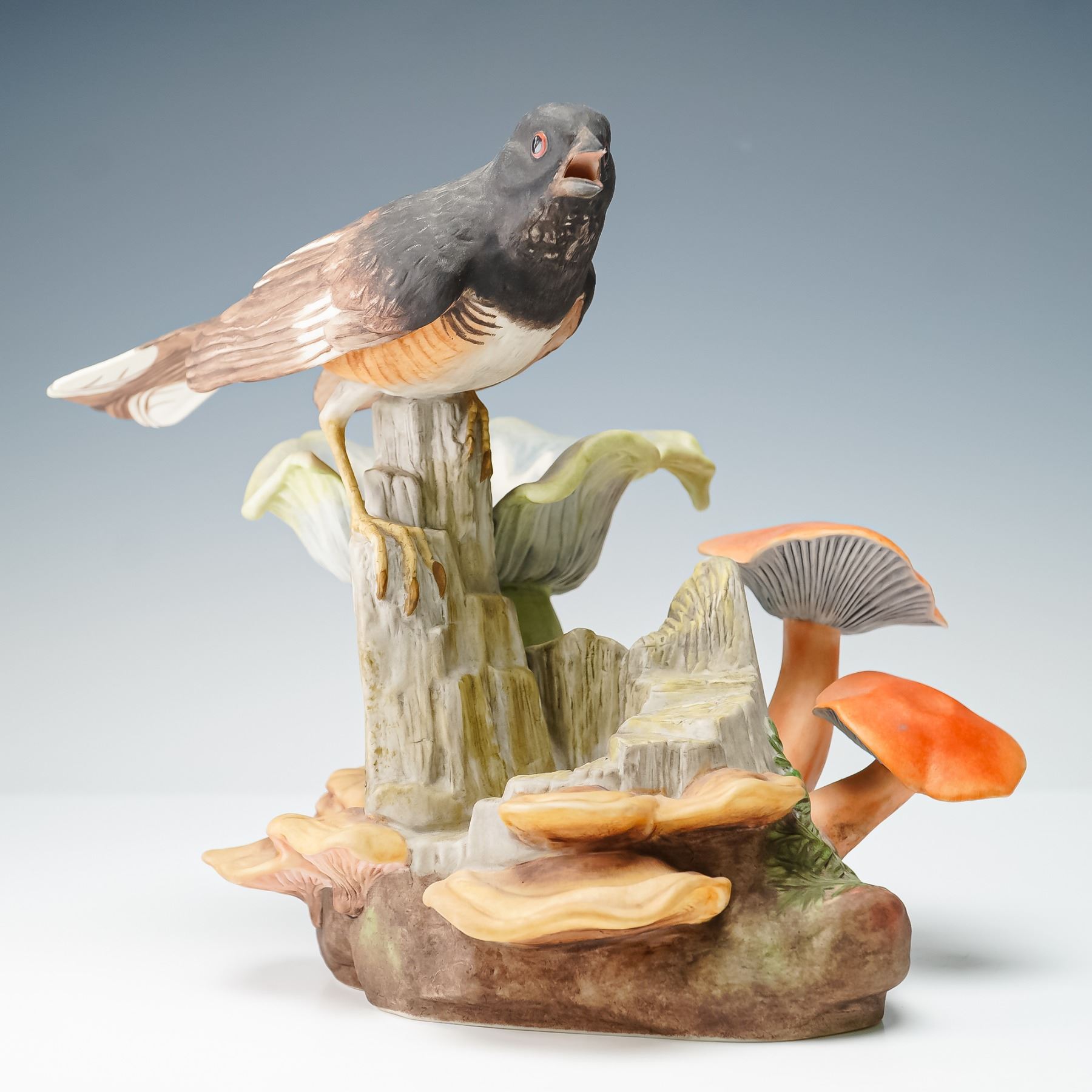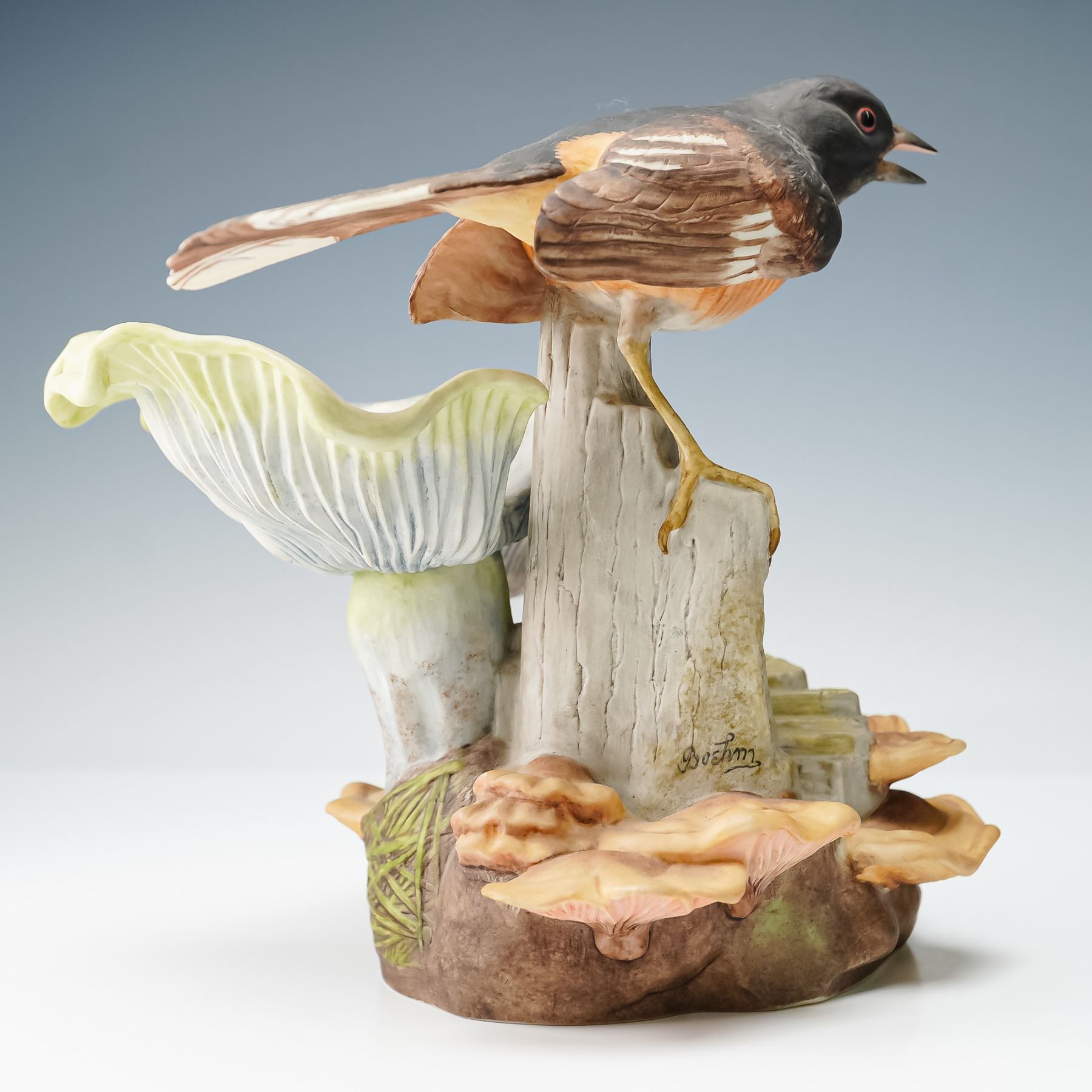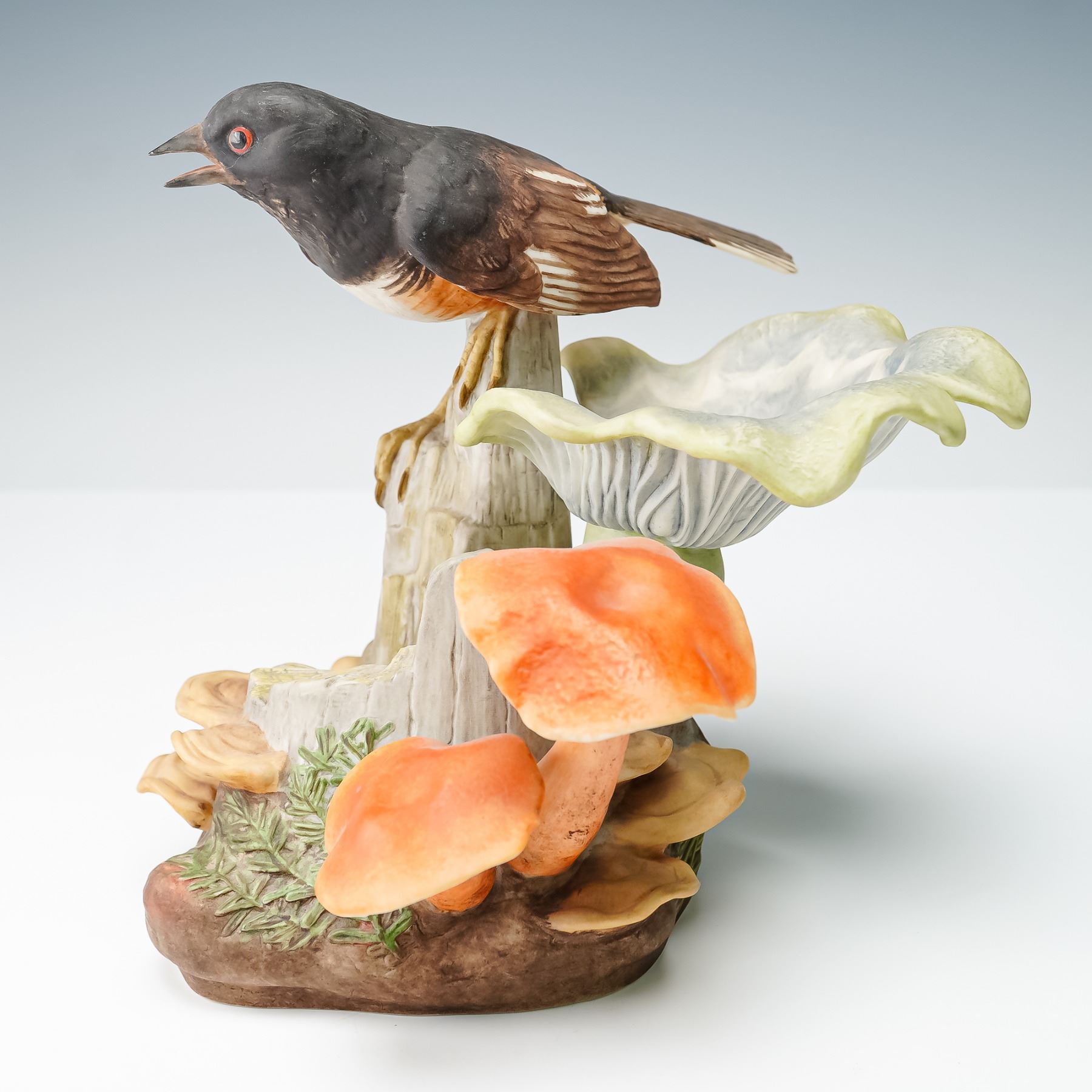A Boehm limited edition porcelain figurine 471 of a Towhee modeled perched among mushrooms and naturalistic foliage. Painted in detailed colors with Boehm backstamp on base.