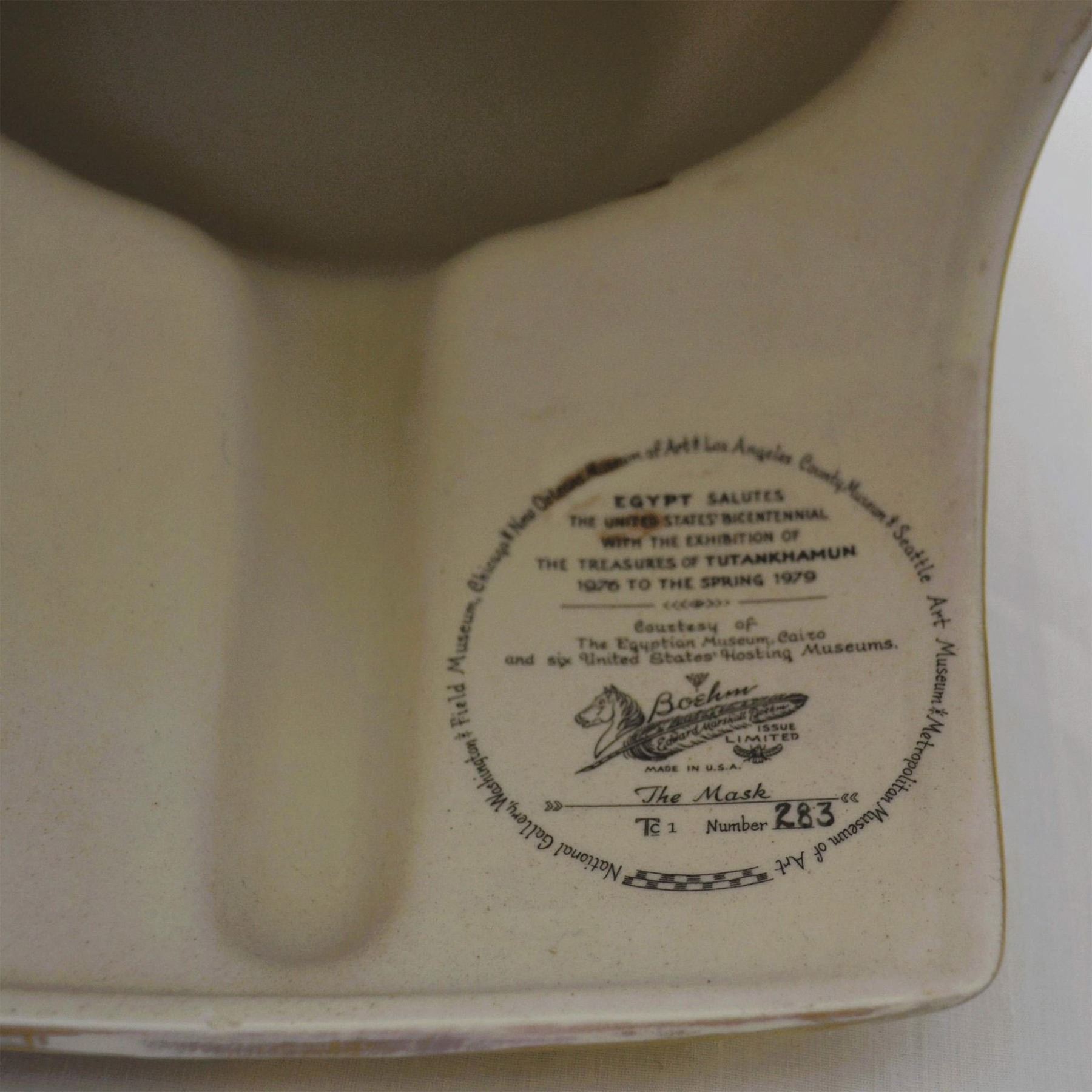 Glazed Porcelain Decorated, hand created, hand painted by the Boehm Studios in the USA. Hallmark: TC-1. Introduced in 1977, A Limited Edition of 850. A sold out edition by 1980, featuring The Great Tut Mask - The Mask of Tutankhamun. The most popular sculpture from the King Tut Collection, produced by the Boehm Studios with all rights, etc., this Collection was based on the actual artifacts from the Original Artifacts from the King Tut Collection Exhibition. Boehm sought out the rights to produce selected artifacts, with fine detail, authentic and exact details from the Original Exhibition Collection. Produced by E.M.Boehm, Inc. in Porcelain, hand created and hand painted, in limited editions for the global world to collect. This is a sold out edition from the 1980, The Tut Mask being the most sought out Sculpture from the entire King Tut Collection offered by E.M.Boehm, Inc. of Trenton, NJ, USA. Fine detail, great coloration and realism, which Boehm is known for Internationally. This sculpture has the Authentic Boehm Backstamp on the underside. A historical offering and opportunity for the avid collector. Don't miss this one! Rare and extremely hard to obtain. Excellent Condition. From the Archival Collection of Re Vann Galleries, G.Reasoner, Owner.